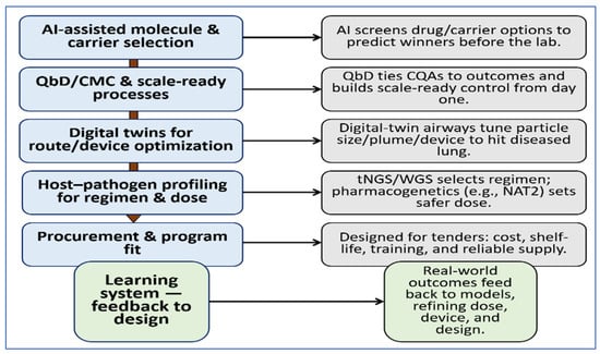 | BDQ: pediatric-leaning nanoemulsions | DoE-guided vegetable-oil nanoemulsion | Preclinical formulation work with in vitro release and stability | Droplets near 190 to 200 nm with controlled release and scalable processing | Supports child-friendly oral BDQ formats | [157] |