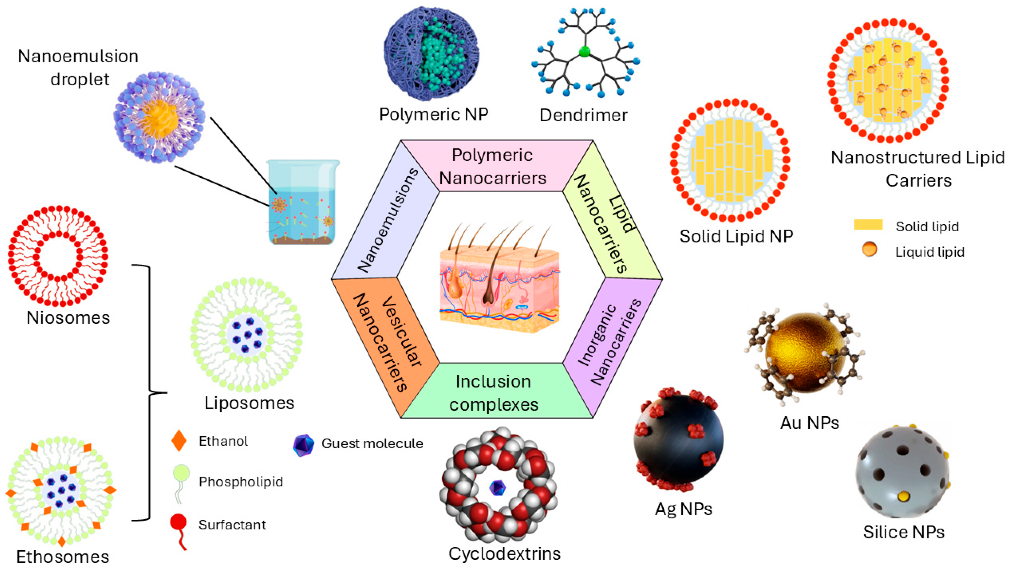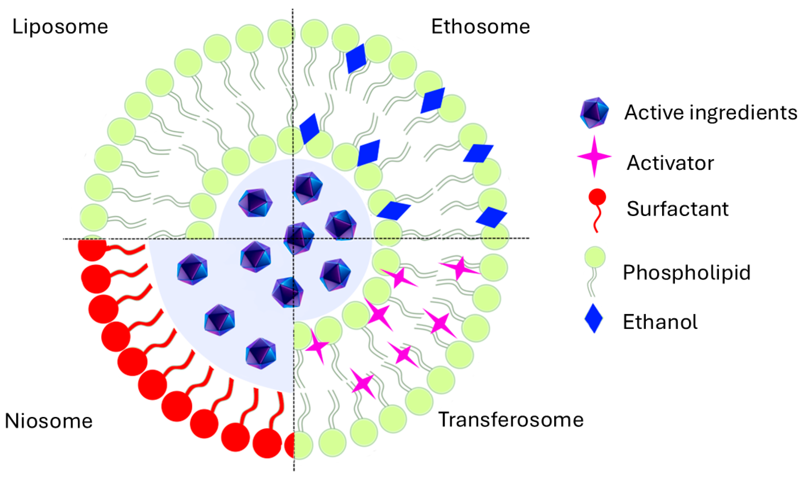 - Paiva-Santos, A.C.; Silva, A.L.; Guerra, C.; Peixoto, D.; Pereira-Silva, M.; Zeinali, M.; Mascarenhas-Melo, F.; Castro, R.; Veiga, F. Ethosomes as Nanocarriers for the Development of Skin Delivery Formulations. Pharm. Res. 2021, 38, 947–970. [Google Scholar] [CrossRef]