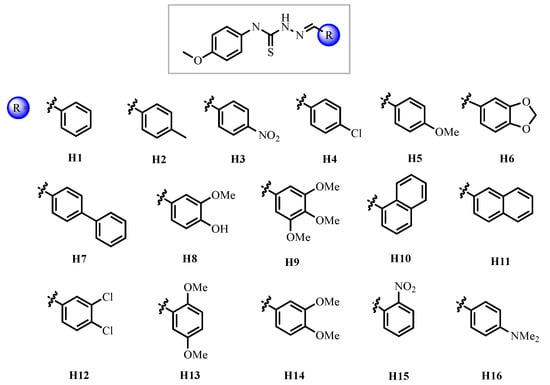 All sixteen thiosemicarbazone (TSC) derivatives were previously synthesized and thoroughly characterized (1H-NMR, 13C-NMR, and HRMS) as reported by us [23]. The compounds utilized in the present biological investigations are from these same authenticated batches. In general, the synthesis involved a two-step procedure. The synthesis began with the reaction of 4-methoxyphenyl isothiocyanate (10 mmol) and hydrazine hydrate (50%, 20 mmol) in isopropanol (20 mL) at ambient temperature for 3 h, which precipitated the key thiosemicarbazide intermediate. This intermediate was isolated by vacuum filtration (Prismatec vaccum pump, model 121, max. displacement 2.2 m3/h–Prismatec, ITU/SP, Brazil), thoroughly washed with isopropanol, and then used directly in the next step. Subsequently, this thiosemicarbazide (1.19 mmol) was condensed with a diverse set of aldehydes (1.25 mmol) in a refluxing ethanol/water solution (11 mL/22 mL) catalyzed by acetic acid. After one hour, the mixture was cooled to room temperature, precipitating the final TSC product, which was collected by vacuum filtration and washed with water.