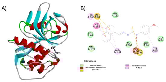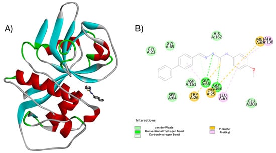 Molecular interaction profile of compound H7 within the cruzain active site. (A) 3D representation of cruzain (PDB ID: 3KKU) with compound H7 bound at the catalytic site. The protein is shown as a ribbon cartoon (α-helices in red, β-sheets in cyan, loops in gray/green), and the ligand is rendered as sticks in dark gray. (B) 2D schematic of ligand–residue interactions highlighting key contacts: van der Waals (green), conventional hydrogen bonds (dark green), carbon hydrogen bonds (light green), π–sulfur (orange), and π–alkyl interactions (purple). Catalytic residue Cys25 and key stabilizing residues such as Gly66, Asp161, Met68, and Leu67 are prominently involved. Image generated using BIOVIA Discovery Studio Visualizer v24.1.0.23298 [30].