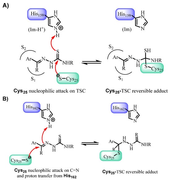 Proposed mechanisms of cruzain inhibition by TSCs. Adapted with permission from Ref. [34]. (A) Nucleophilic attack of the catalytic cysteine (Cys25) on the thiosemicarbazone (TSC), leading to the formation of a reversible Cys25–TSC adduct. (B) Nucleophilic attack of Cys25 on the C=N bond of the TSC, with concomitant proton transfer from His162, also resulting in a reversible Cys25–TSC adduct.