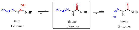 Illustration of the isomeric and tautomeric structures of TSCs. The different colors indicate specific atoms/groups: blue for the aromatic moiety (Ar), red for sulfur atoms, and black for carbon, nitrogen, and hydrogen atoms. The double-headed arrows represent tautomeric or isomeric equilibria between the different forms. The square in the middle highlights the thione E-isomer as the predominant form under polar conditions.