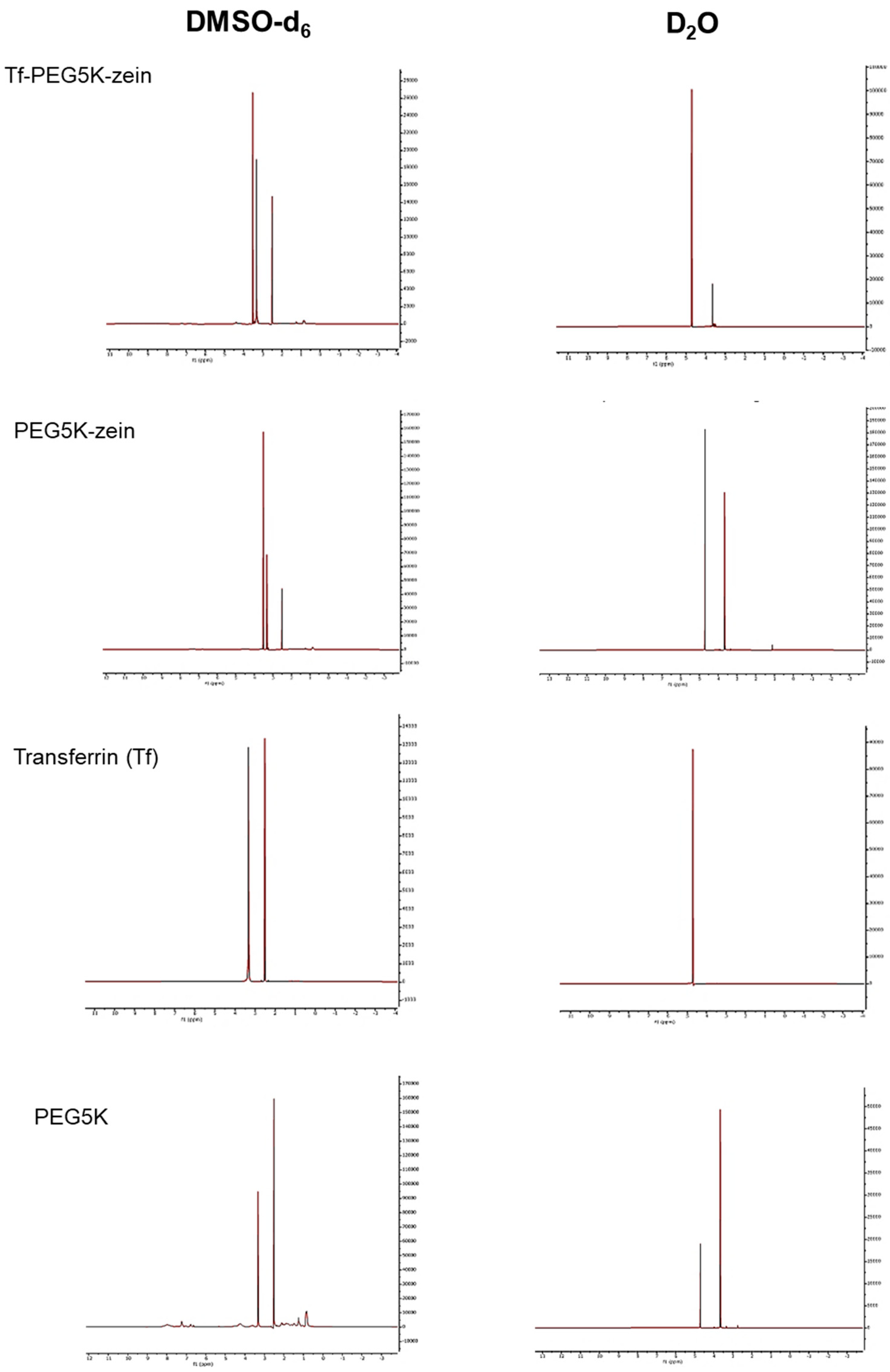 NMR analyses supported the successful synthesis of PEGylated zein and subsequent Tf conjugation, consistent with the expected core–shell organization in which zein forms the hydrophobic core and PEG constitutes the hydrophilic corona [