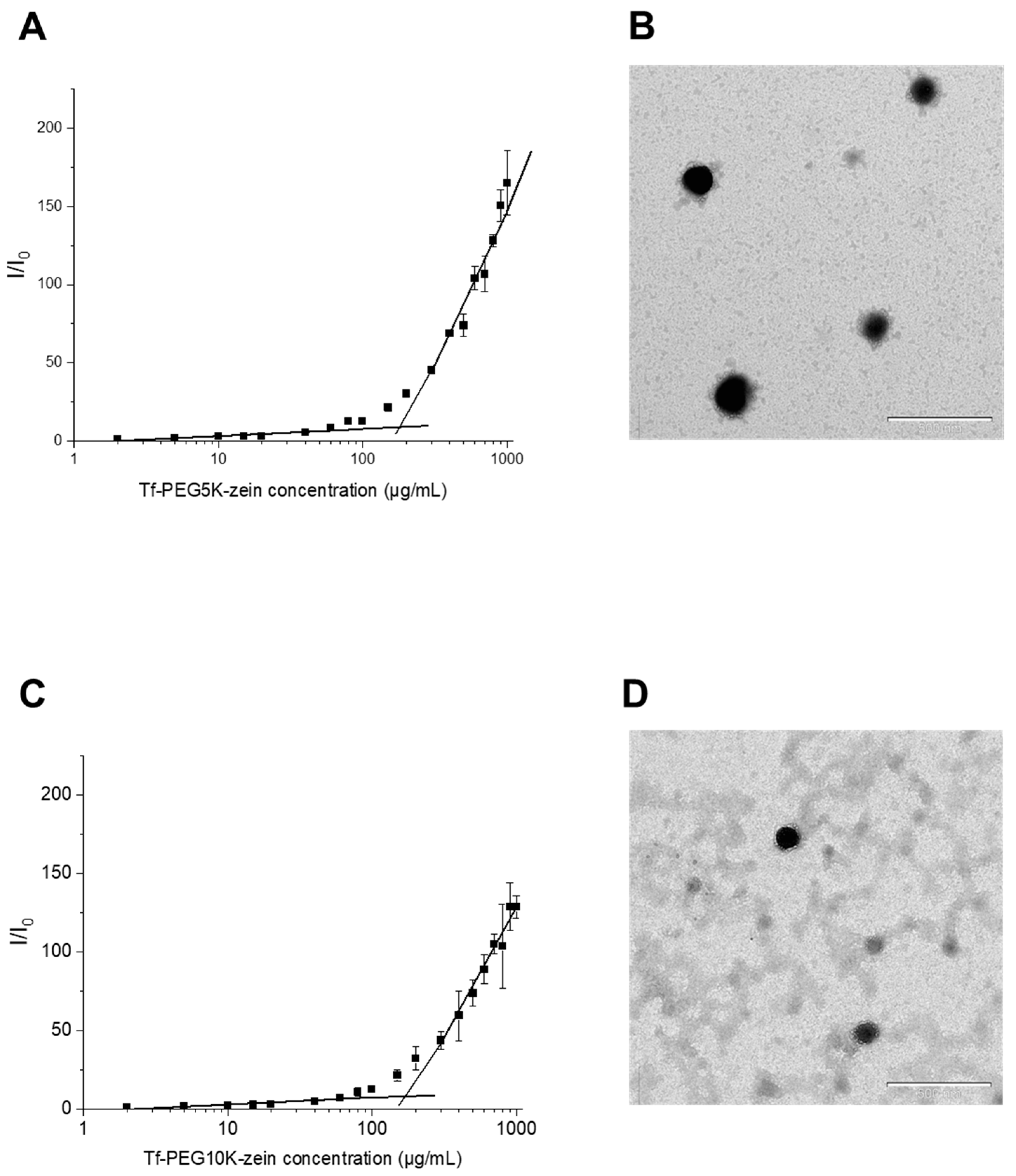 2.3.1. Determination of Critical Micelle Concentration (CMC) of Tf-Bearing, PEGylated Zein-Based Micelles