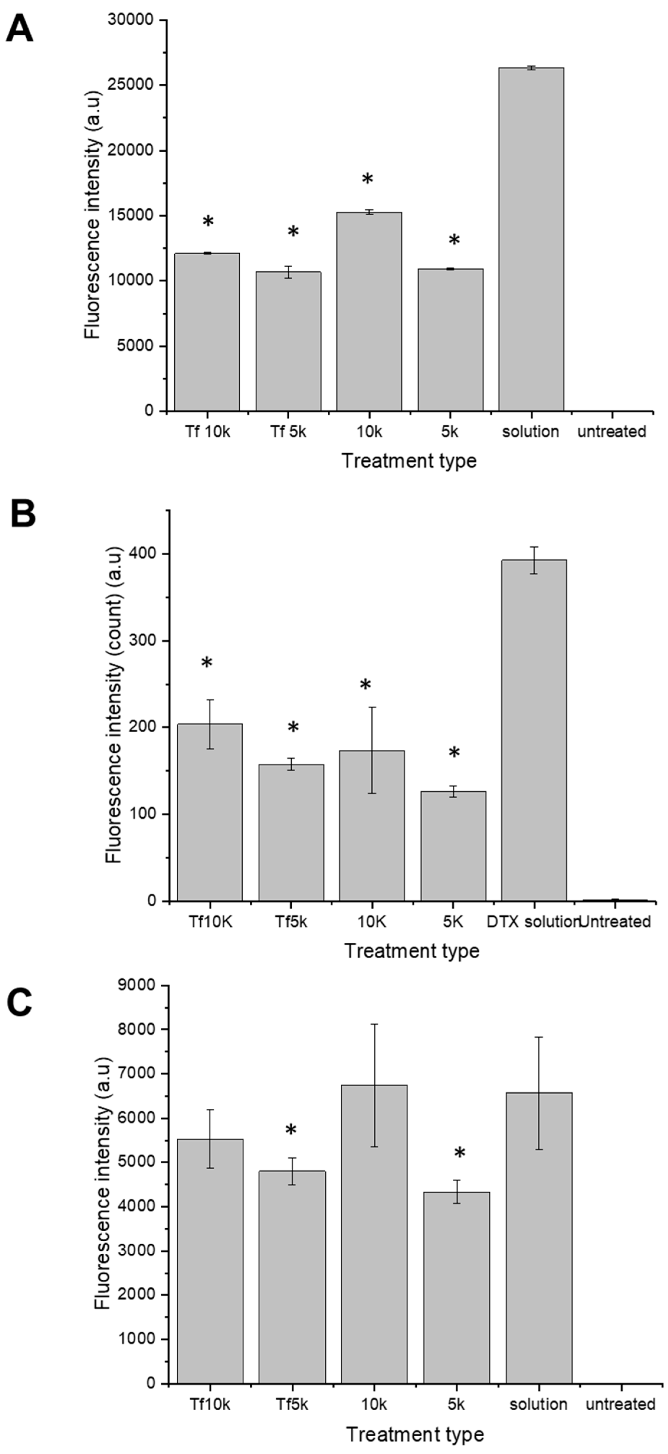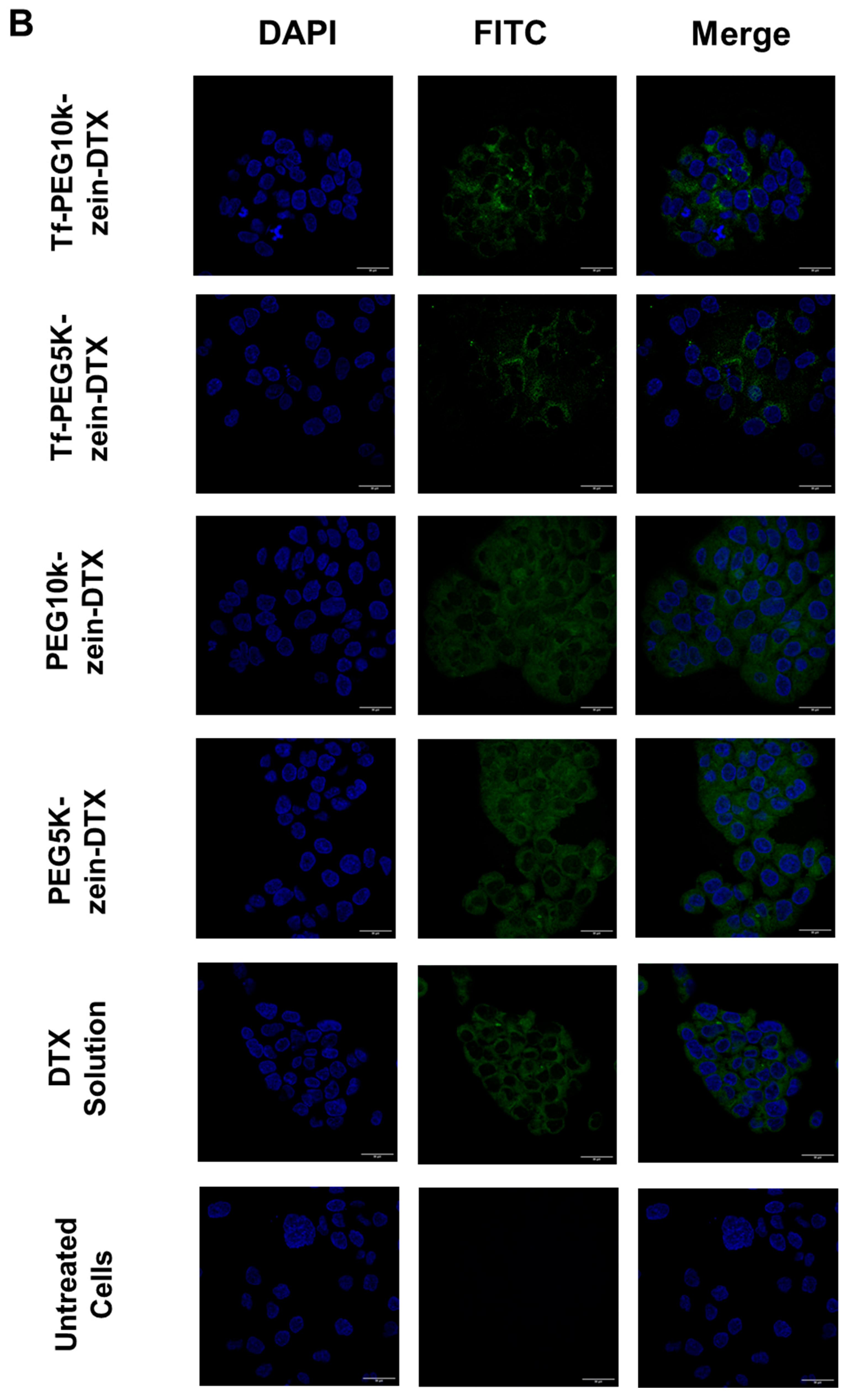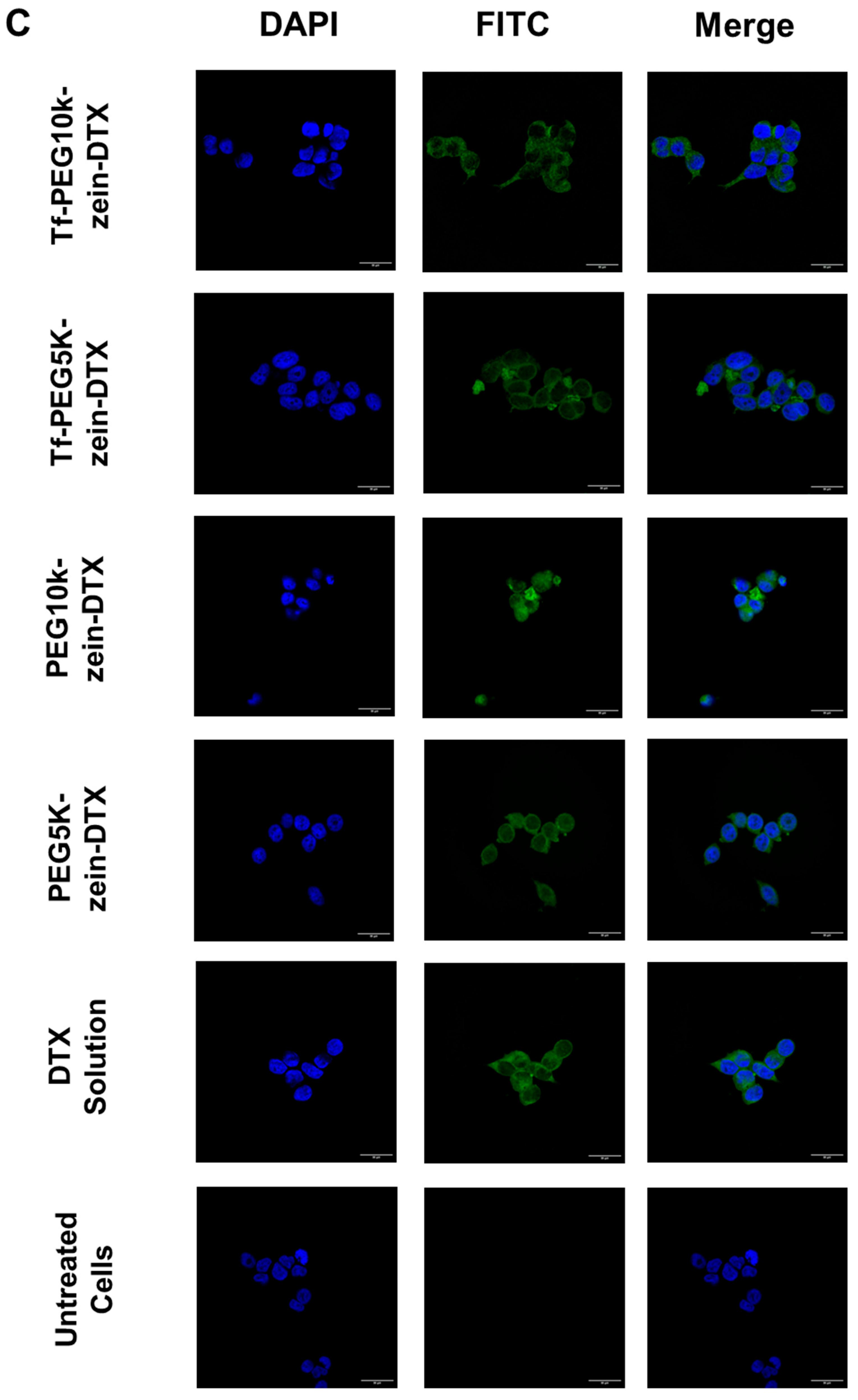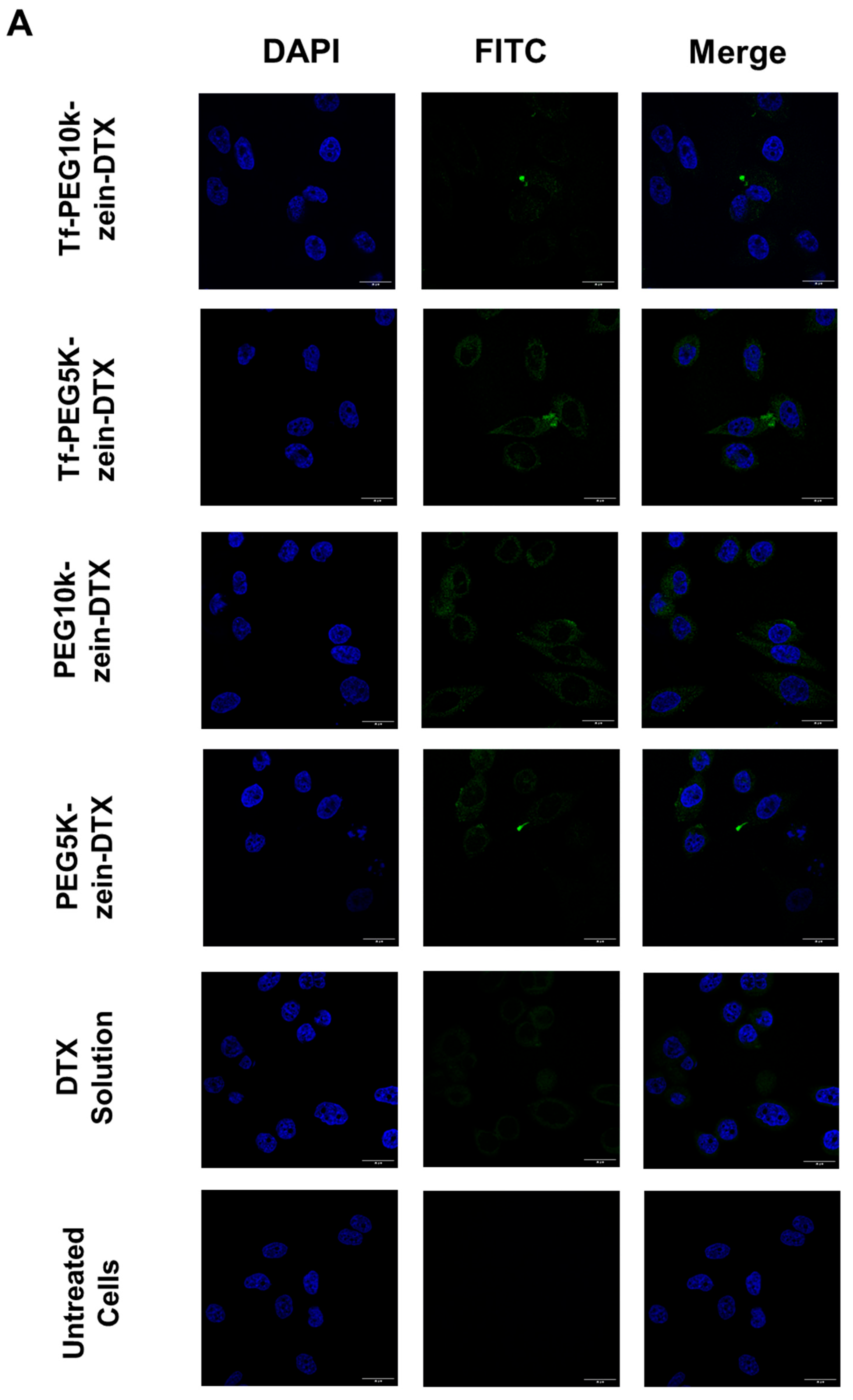 Yellow zein (from maize), human holo-transferrin (Tf), cupric sulphate (pentahydrate) (CuSO4.5 H2O), 2-Iminothiolane hydrochloride (Traut’s reagent), dimethyl sulfoxide (DMSO), deuterated dimethyl sulfoxide-d6, absolute ethanol (≥99.8%), Folin and Ciocalteu’s phenol reagent, anhydrous sodium carbonate (Na2CO3), sodium potassium tartrate (C4H4KNaO6), bovine serum albumin (BSA), Vivaspin® 6 centrifugal filter tubes with molecular weight cut-offs (MWCO) of 5000 and 100,000 Daltons, citric acid monohydrate, trisodium citrate dihydrate, docetaxel purum (≥97.0%), sodium hydroxide (NaOH), chlorpromazine, colchicine, filipin, poly-L-lysine, phosphate buffer saline, 3-(4,5-dimethylthiazol-2-yl)-2,5-diphenyl-tetrazolium bromide (MTT), trypsin, Nile red, Triton X-100, and Minimum Essential Eagle’s Medium (MEM) were purchased from Sigma-Aldrich (Poole, UK). Methoxy PEG succinimidyl carboxymethyl esters with molecular weights of 5000 Da (mPEG-SCM-5K) and 10,000 Da (mPEG-SCM-10K) were obtained from JenKem Technology (Plano, TX, USA). Glycine and Snakeskin® dialysis tubing (7–10 kDa MWCO) were supplied by Thermo Fisher Scientific (Loughborough, UK). Sodium pyruvate, L-glutamine, penicillin-streptomycin, 4-(2-hydroxyethyl) piperazine-1-ethanesulfonic acid (HEPES buffer, 10 mM), Roswell Park Memorial Institute (RPMI)-1640 cell culture medium, fetal bovine serum (FBS), and Tubulin Tracker® Green (Oregon Green® 488 Taxol, bis-acetate) were purchased from Life Technologies (Paisley, UK). Vectashield® mounting medium containing 4′,6-diamidino-2-phenylindole (DAPI) was purchased from Vector Laboratories (Peterborough, UK).