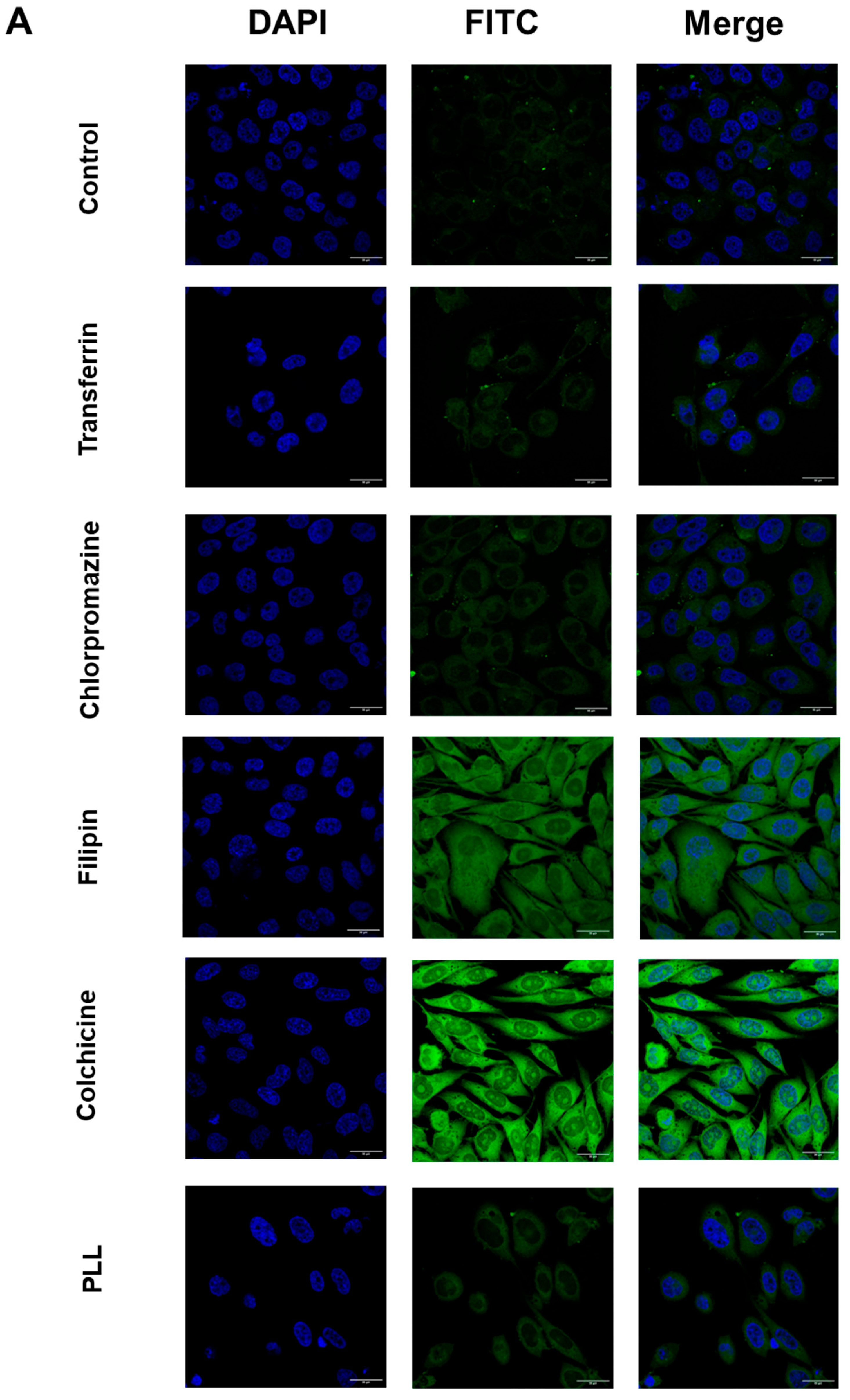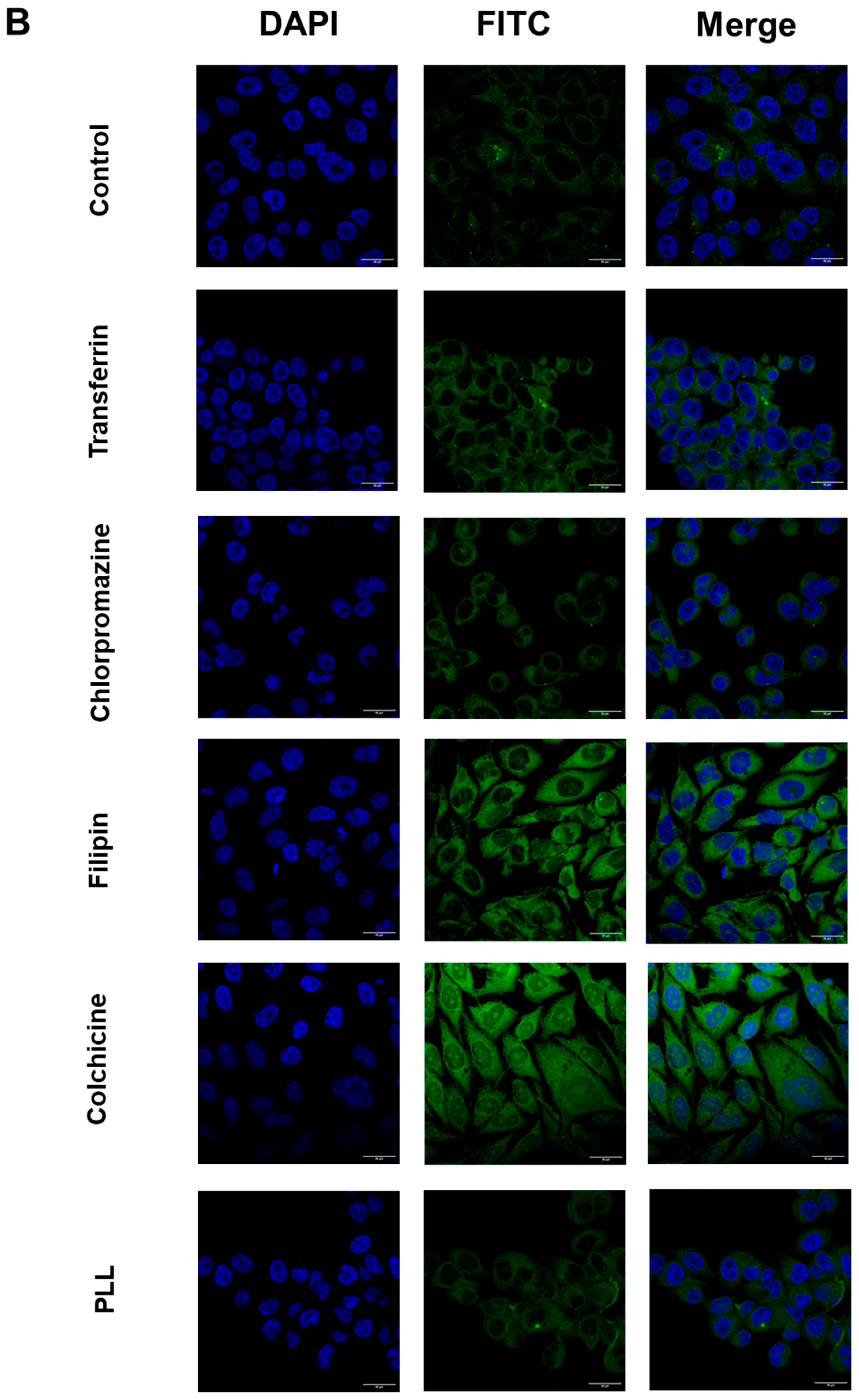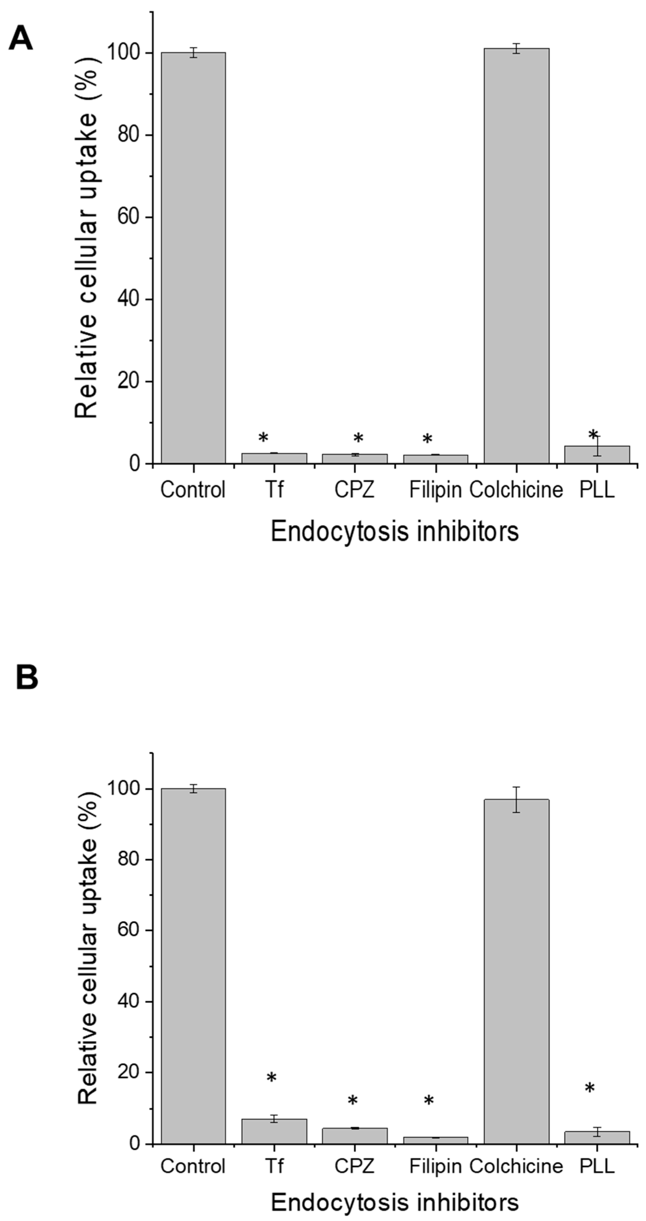 Mechanistic studies using pharmacological inhibitors indicated that internalization of Tf-functionalized micelles involved caveolae- and clathrin-associated pathways as well as transferrin receptor–related uptake, supported by significant inhibition with filipin, chlorpromazine, and free transferrin. Poly-L-lysine also inhibited uptake, consistent with an electrostatic component to interaction/attachment in these systems. By contrast, colchicine produced negligible effects, suggesting macropinocytosis did not play a major role under the conditions tested, consistent with prior observations for PEGylated zein micelles in another cancer model [