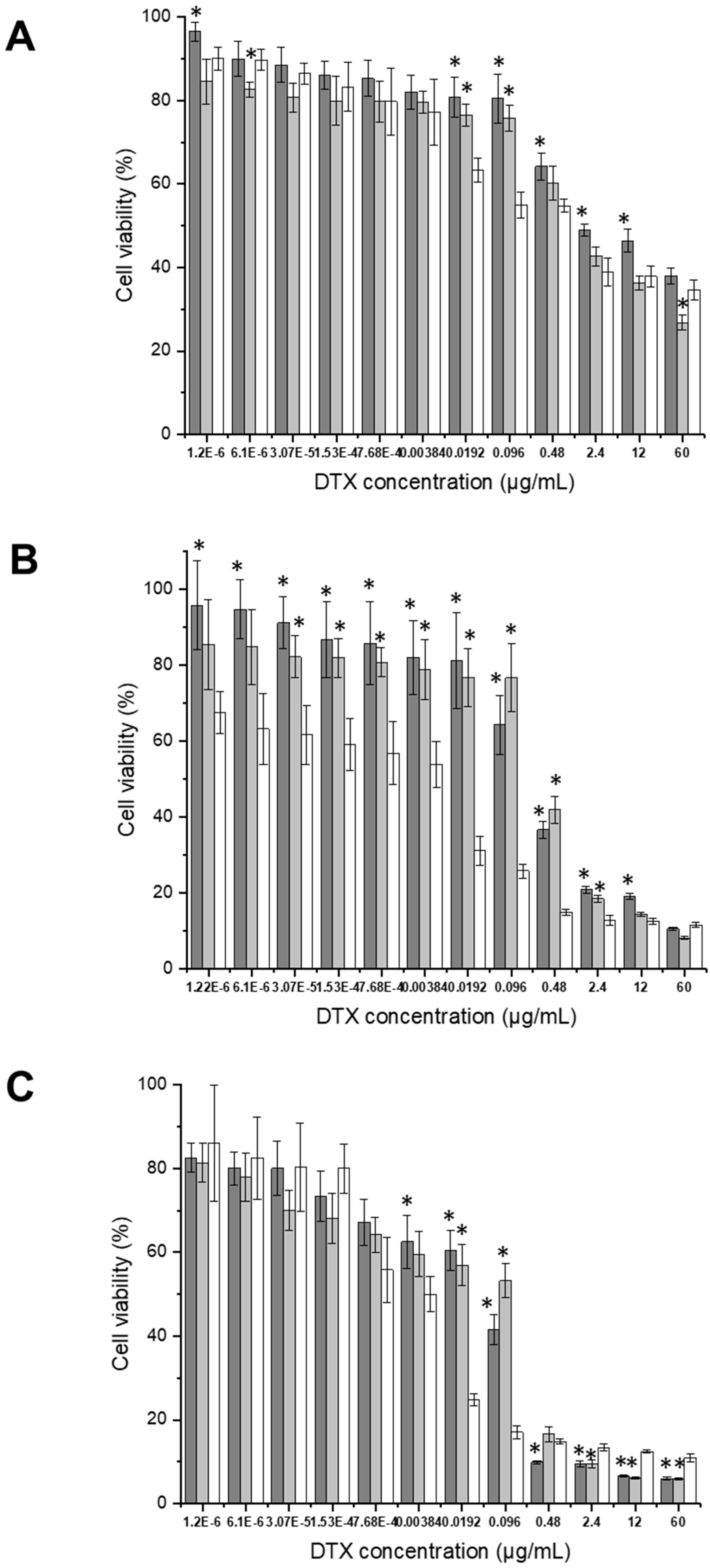Anti-proliferative efficacy further clarified the functional consequences of these uptake patterns. Docetaxel in solution consistently showed the lowest IC