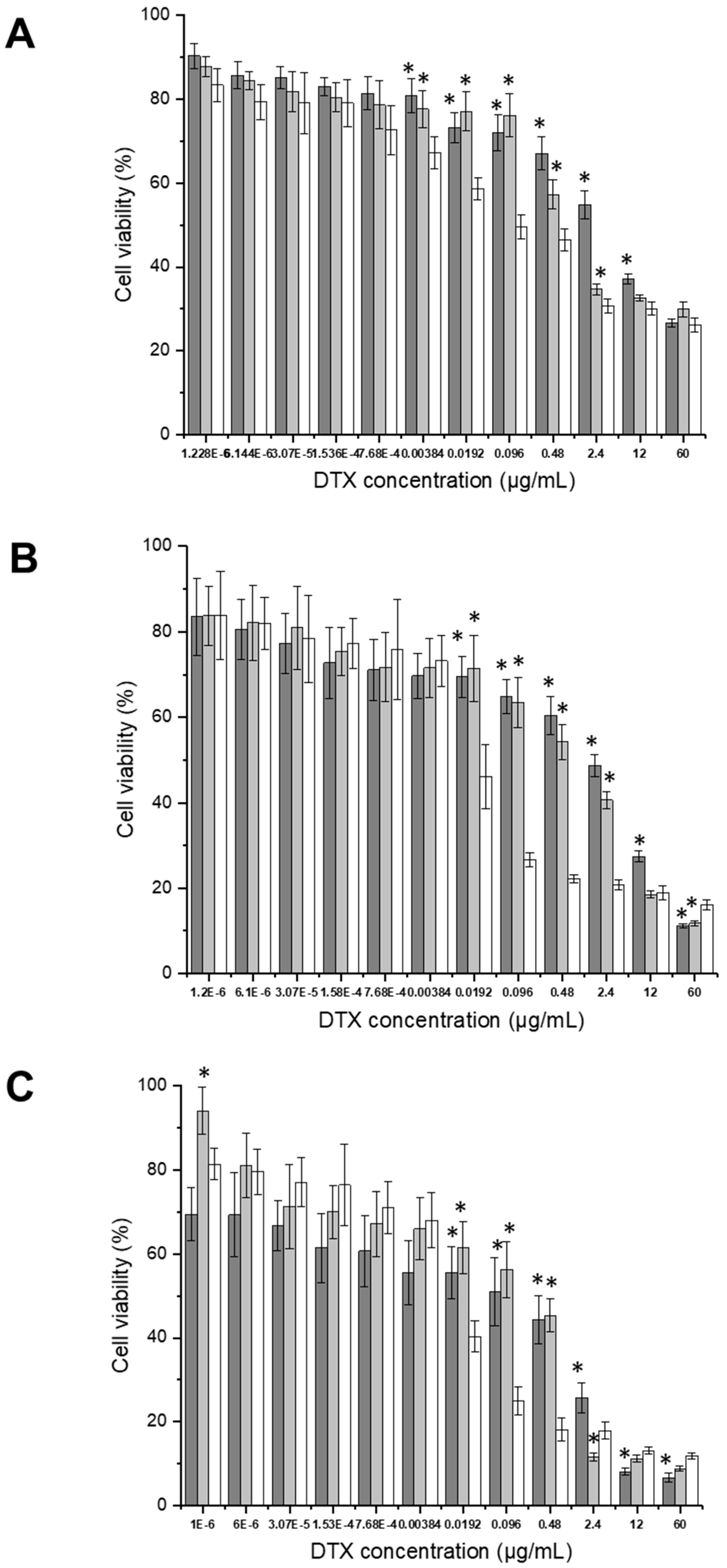 In vitro uptake studies revealed several key patterns. Across all three cell lines, free docetaxel showed the highest cellular uptake, as expected for a small molecule in 2D monolayer assays where diffusion and rapid membrane access can dominate compared with nanocarriers that require binding/internalization and intracellular release [