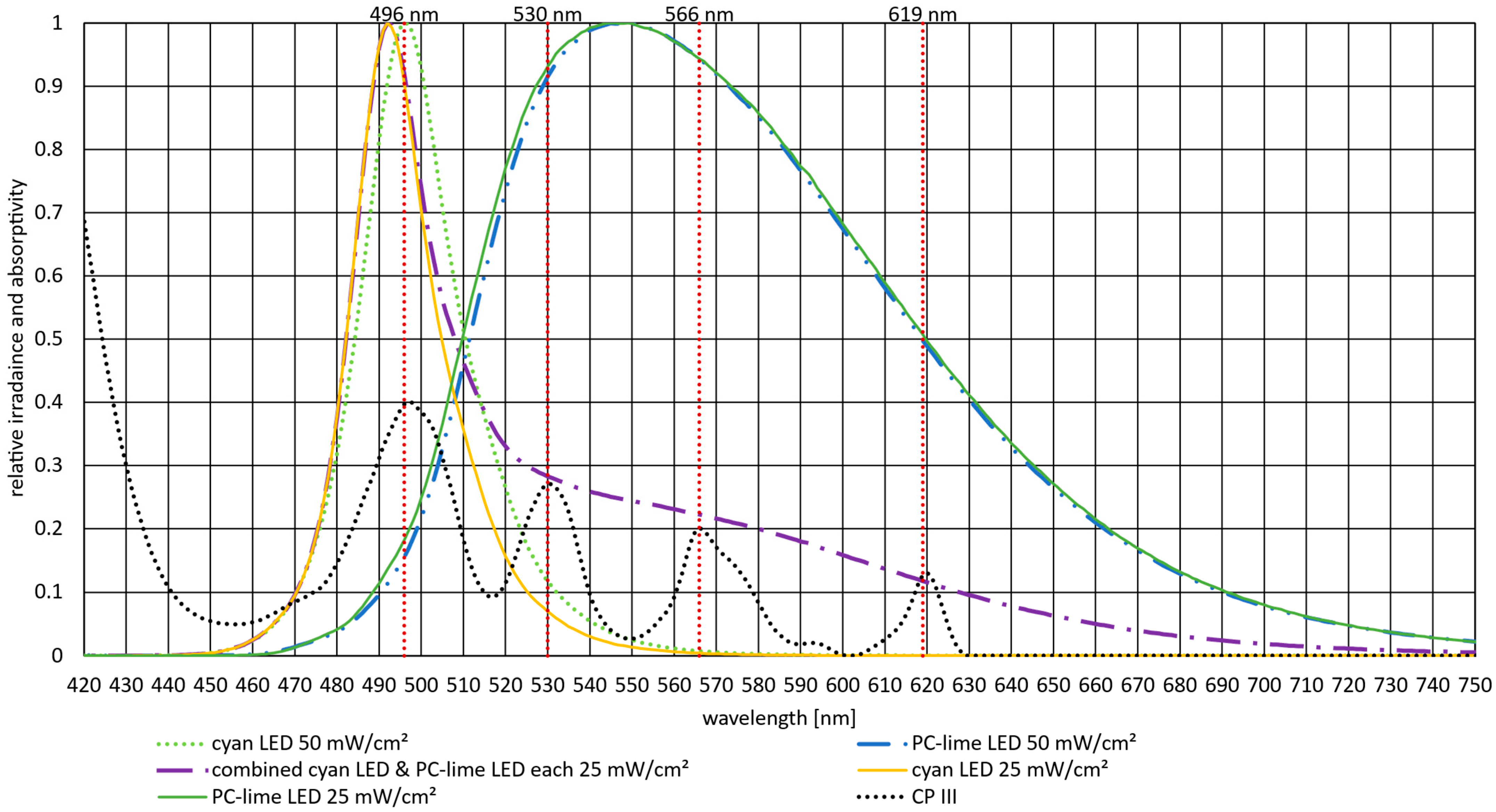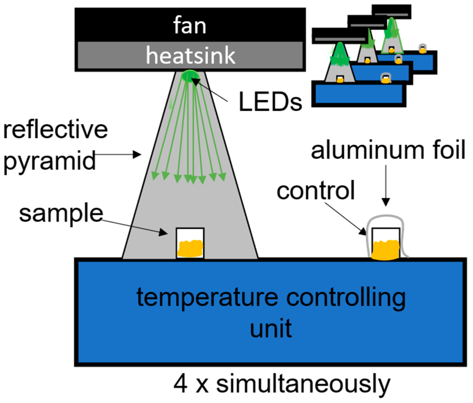 | Setup | Active LED | Irradiance [mW/cm2] | Irradiation Mode |