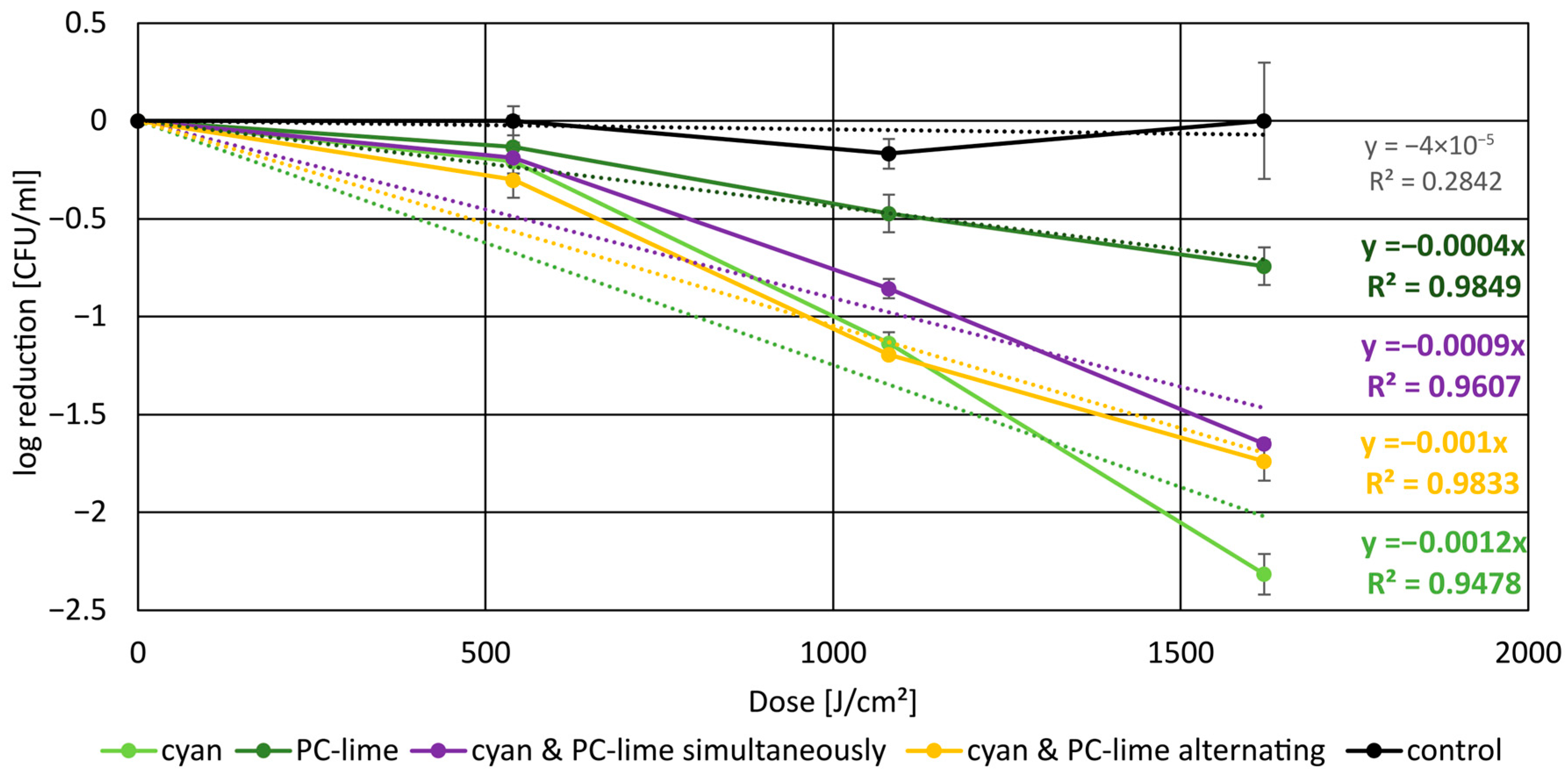 - Sabino, C.P.; Wainwright, M.; Dos Anjos, C.; Sellera, F.P.; Baptista, M.S.; Lincopan, N.; Ribeiro, M.S. Inactivation kinetics and lethal dose analysis of antimicrobial blue light and photodynamic therapy. Photodiagnosis Photodyn. Ther. 2019, 28, 186–191. [Google Scholar] [CrossRef] [PubMed]