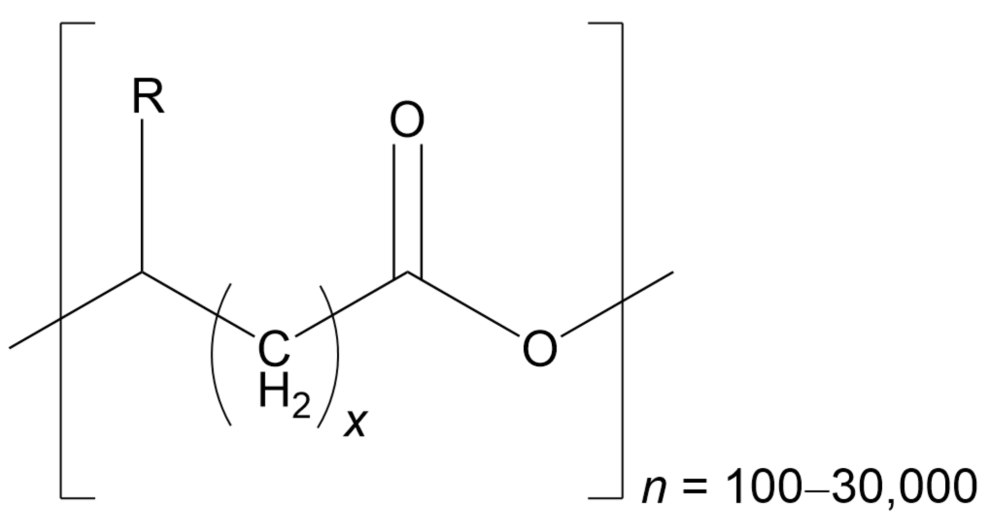 - Winnacker, M. Polyhydroxyalkanoates: Recent Advances in Their Synthesis and Applications. Eur. J. Lipid Sci. Technol. 2019, 121, 1900101. [Google Scholar] [CrossRef]