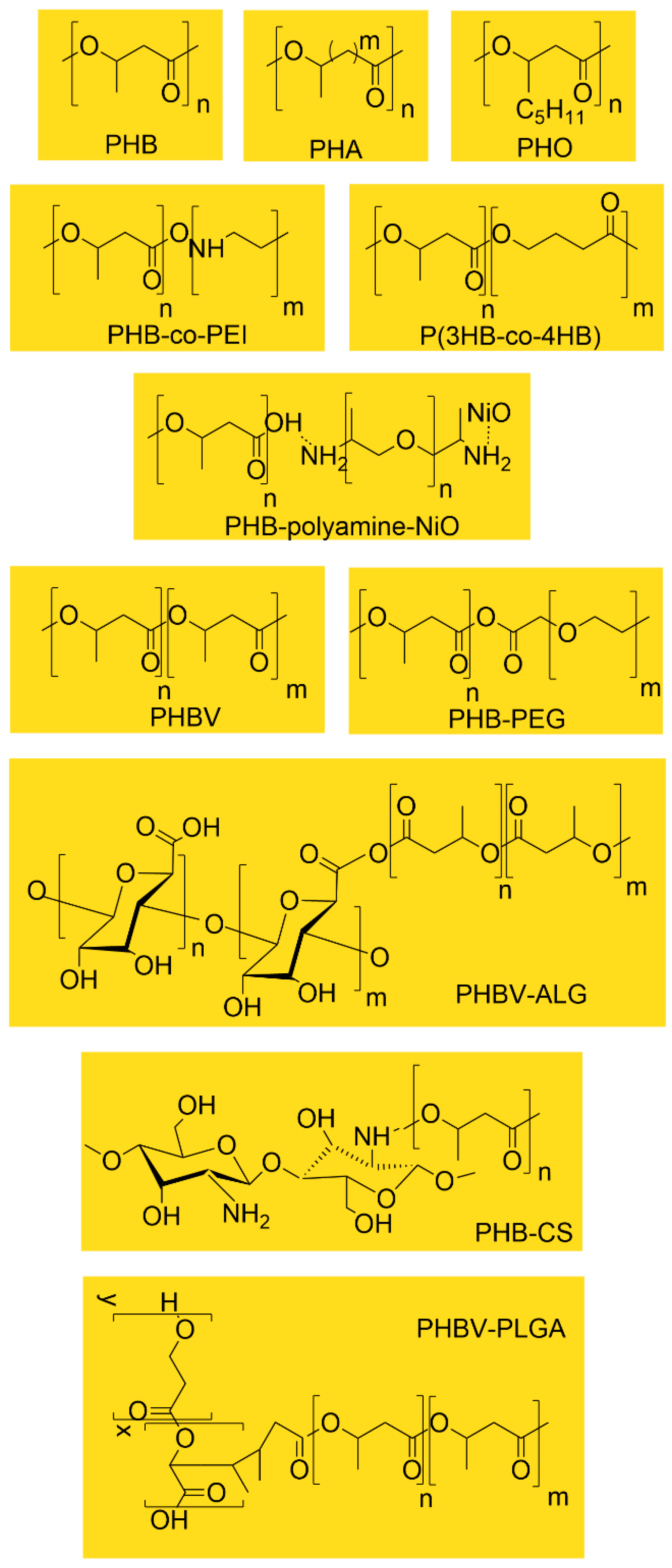 | PHO/a-PHB; PHB/a-PHB | Polymeric material for cardiovascular engineering | 2012 | [199] |