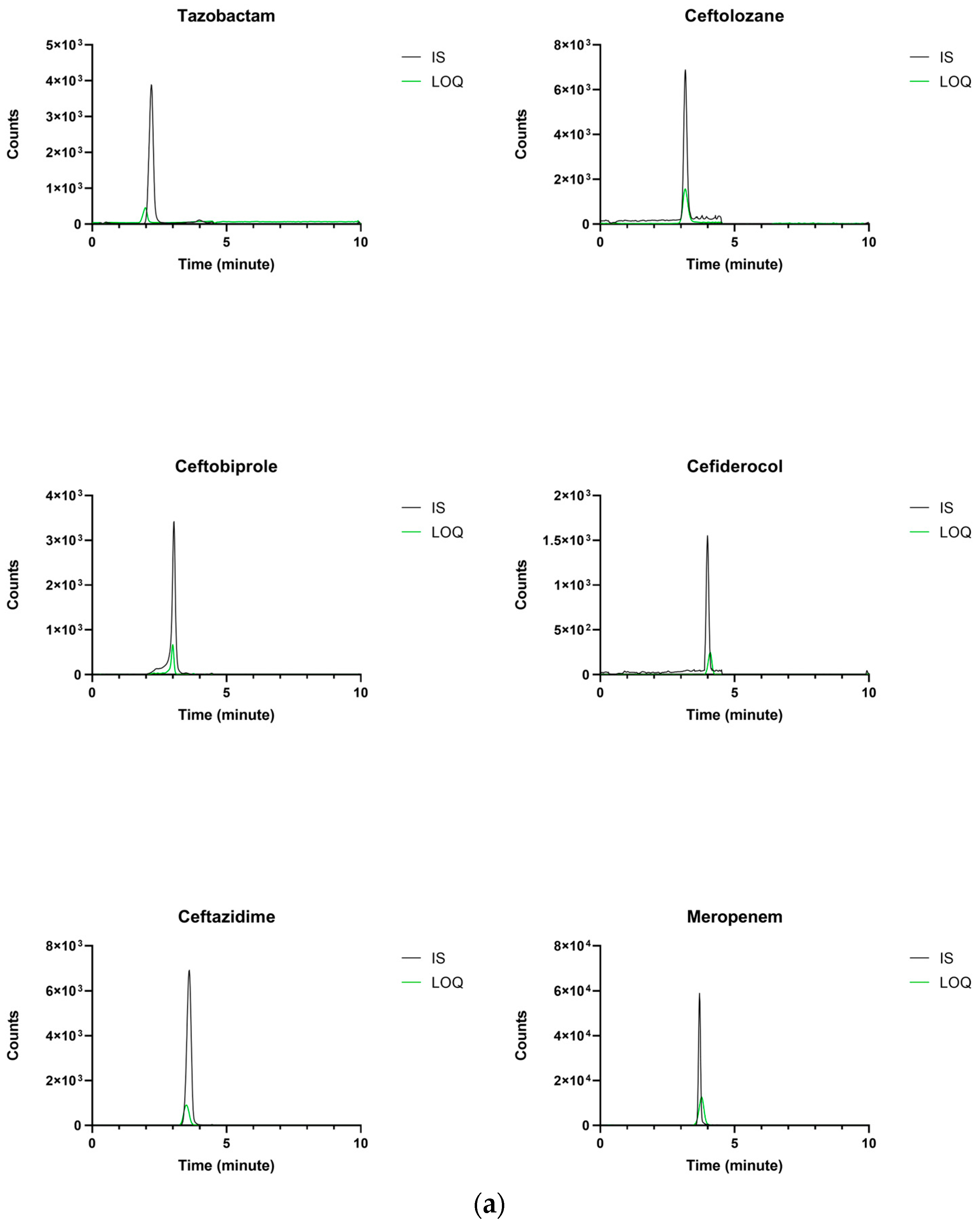 - Llopis, B.; Bleibtreu, A.; Schlemmer, D.; Robidou, P.; Paccoud, O.; Tissot, N.; Noé, G.; Junot, H.; Luyt, C.-É.; Funck-Brentano, C.; et al. Simple and Accurate Quantitative Analysis of Cefiderocol and Ceftobiprole in Human Plasma Using Liquid Chromatography-Isotope Dilution Tandem Mass Spectrometry: Interest for Their Therapeutic Drug Monitoring and Pharmacokinetic Studies. Clin. Chem. Lab. Med. 2021, 59, 1800–1810. [Google Scholar] [CrossRef] [PubMed]