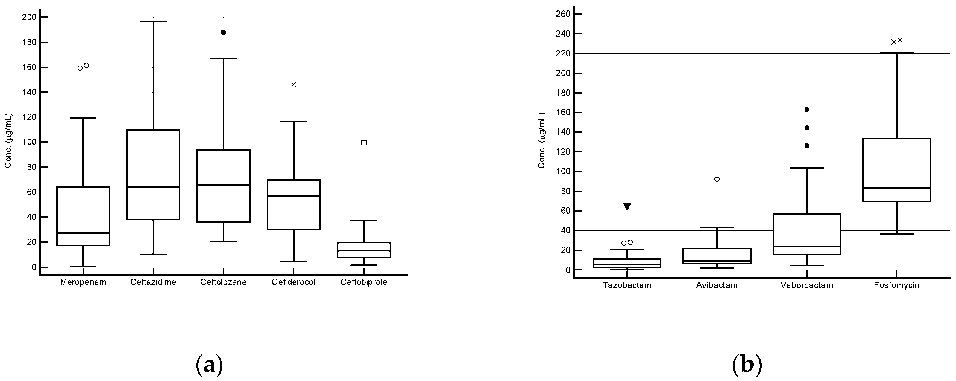 - Barone, R.; Conti, M.; Giorgi, B.; Gatti, M.; Cojutti, P.G.; Viale, P.; Pea, F. Fast and Sensitive Method for Simultaneous Quantification of Meropenem and Vaborbactam in Human Plasma Microsamples by Liquid Chromatography-Tandem Mass Spectrometry for Therapeutic Drug Monitoring. Antibiotics 2023, 12, 719. [Google Scholar] [CrossRef]