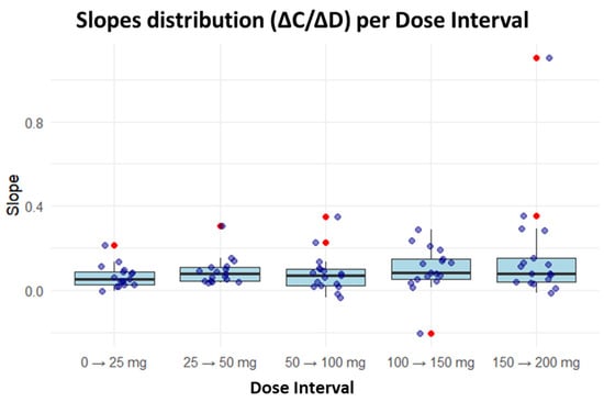 Analysis of the derived parameters revealed a nonlinear dose–concentration relationship. In the first three titration intervals (0–25 mg, 25–50 mg and 50–100 mg), the median slope (ΔC/ΔD) remained relatively constant. However, in the final two intervals (100–150 mg and 150–200 mg), greater dispersion (wider IQR) and several outliers were observed. Occasionally, negative slopes were identified, indicating a decrease in CNBp despite dose escalation. Most slope values, representing the typical PK range, were between 0.05 and 0.15 µg/mL/mg (Figure 2).