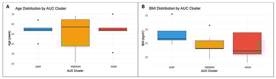 Distribution of age (A) and BMI (B) across AUC exposure clusters. Boxes indicate the interquartile range with the median, whiskers show the data range, and dots represent outliers.