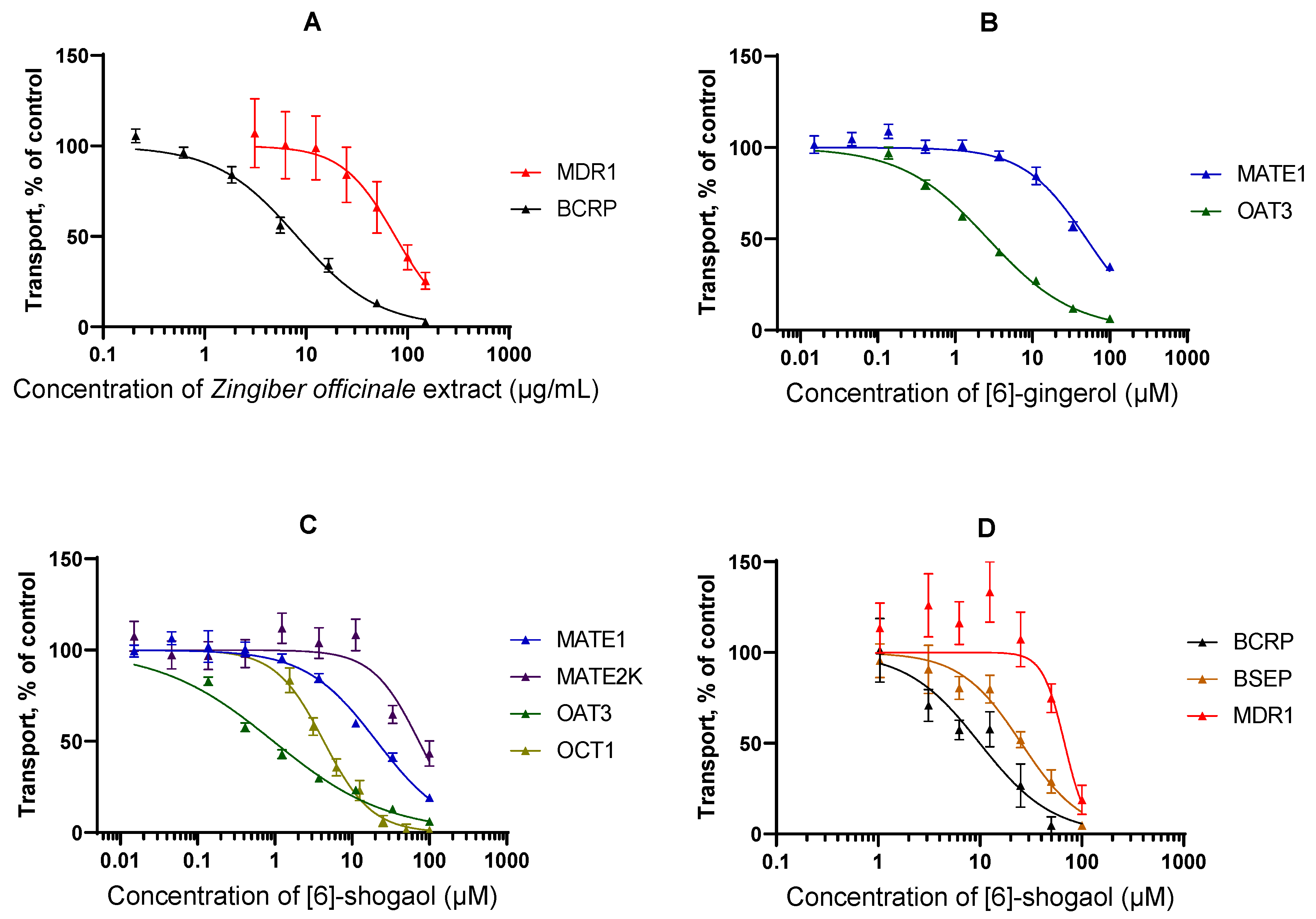 APA StyleVarga, T., Szilvásy, N., Schelz, Z., Kanizsainé Minorics, R., Veres, K., Temesszentandrási-Ambrus, C., Tátrai, P., Hohmann, J., Gáborik, Z., & Kis, E. (2026). Ginger and Its Purified Major Components Inhibit Clinically Relevant Uptake and Efflux Transporters In Vitro. Pharmaceutics, 18(2), 149. https://doi.org/10.3390/pharmaceutics18020149