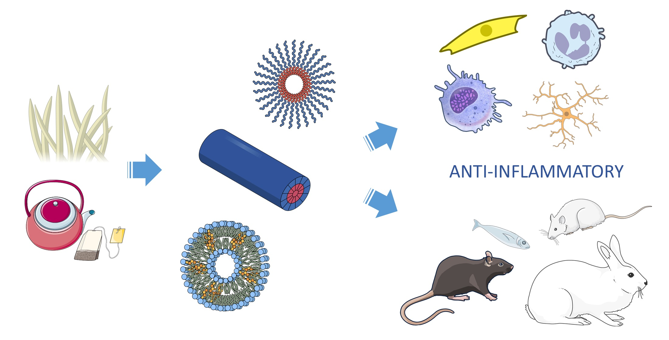 | Inulin-based nanoparticles with cannabidiol | RAW 264.7 cells | - | Reduction in the levels of NO, Inos, TNF-α and IL-1β; Increase in the production of IL-4 and IL-10 | [81] |