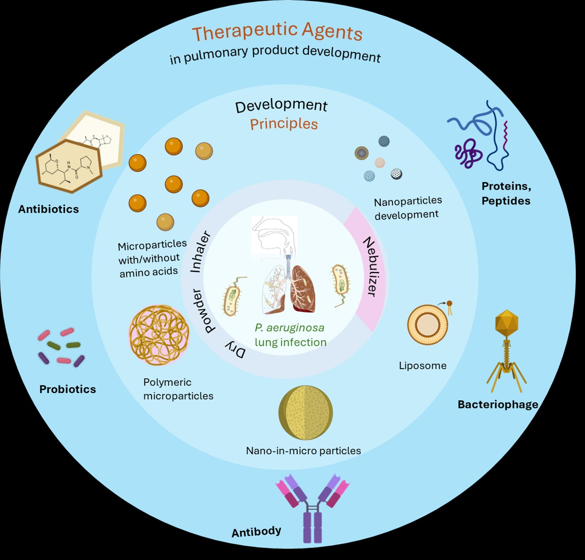 Direct inhalation of antibiotics for P. aeruginosa respiratory tract infections can offer several advantages, including high-dose deposition at the site of infection, reduced systemic toxicity, and controlled drug release. Formulation scientists aim to enhance antibiotic delivery via particle engineering techniques to maintain optimal size, size distribution, shape, texture, charge, hygroscopicity, and rheology to increase deposition in the bronchioles and alveoli [5].