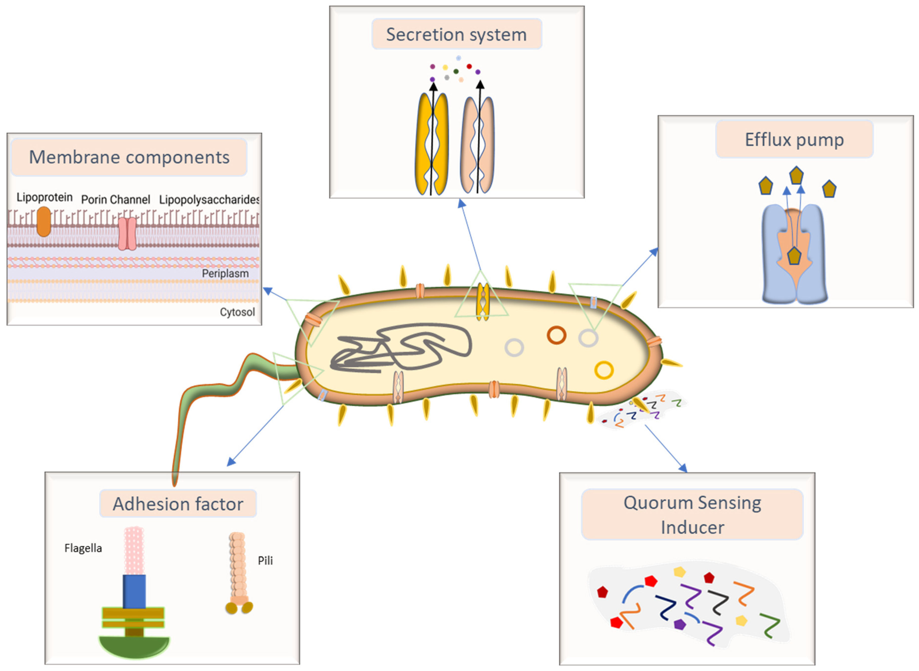 Figure 1. The types of structural and functional components of P. aeruginosa responsible for lung infections: adhesion factor, membrane components, secretion system, efflux pump, and quorum-sensing inducer.