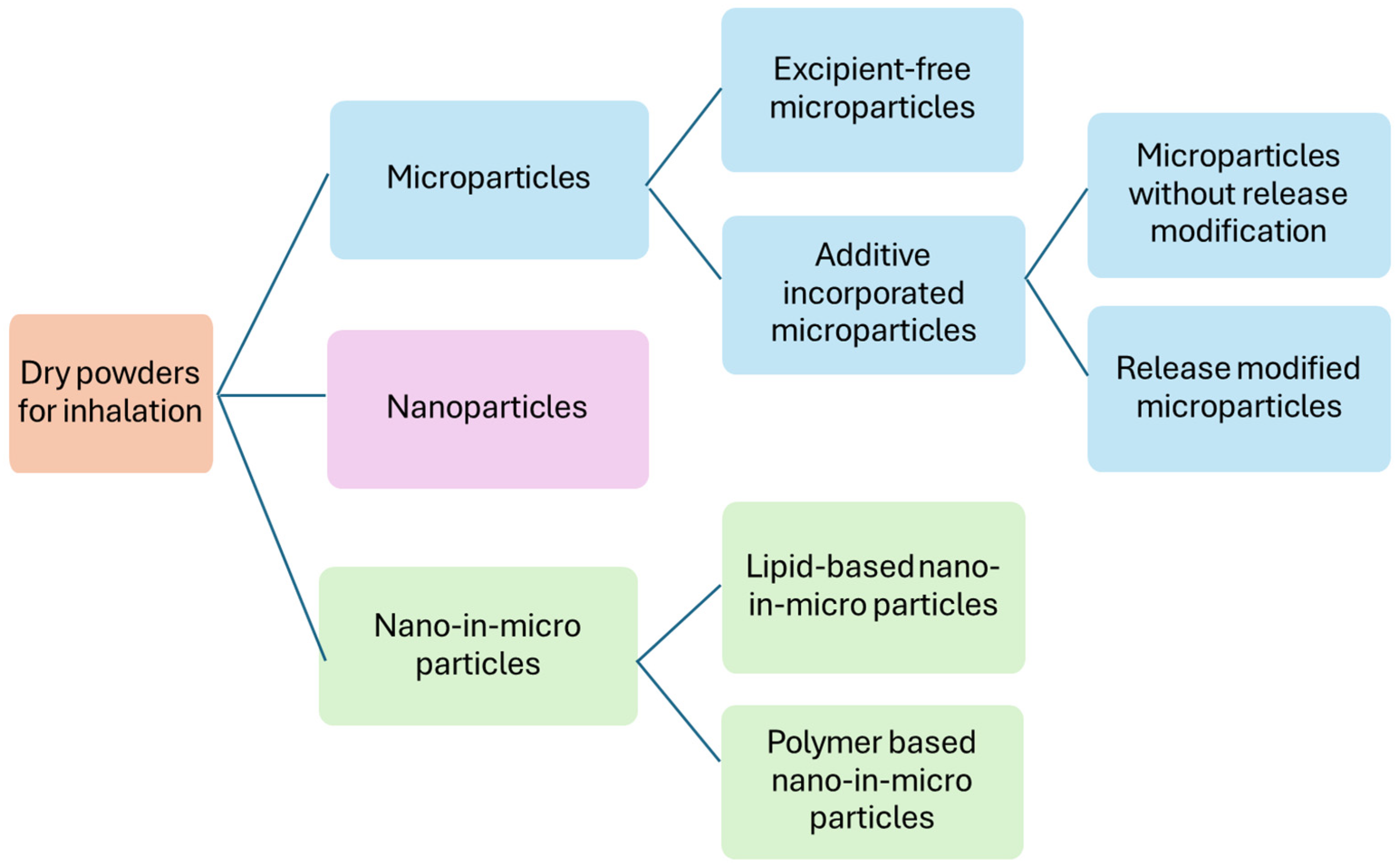 A wide range of antibiotics has been explored for DPI formulation, including cephalosporins, monobactams, carbapenems, aminoglycosides, macrolides, and fluoroquinolones. Ciprofloxacin and levofloxacin have received the most research attention for anti-P. aeruginosa activity. The DPI formulation strategies employed in the literature can be broadly categorized into three main approaches (Figure 2): (1) microparticles, (2) nanoparticles, and (3) nano-in-microparticles.