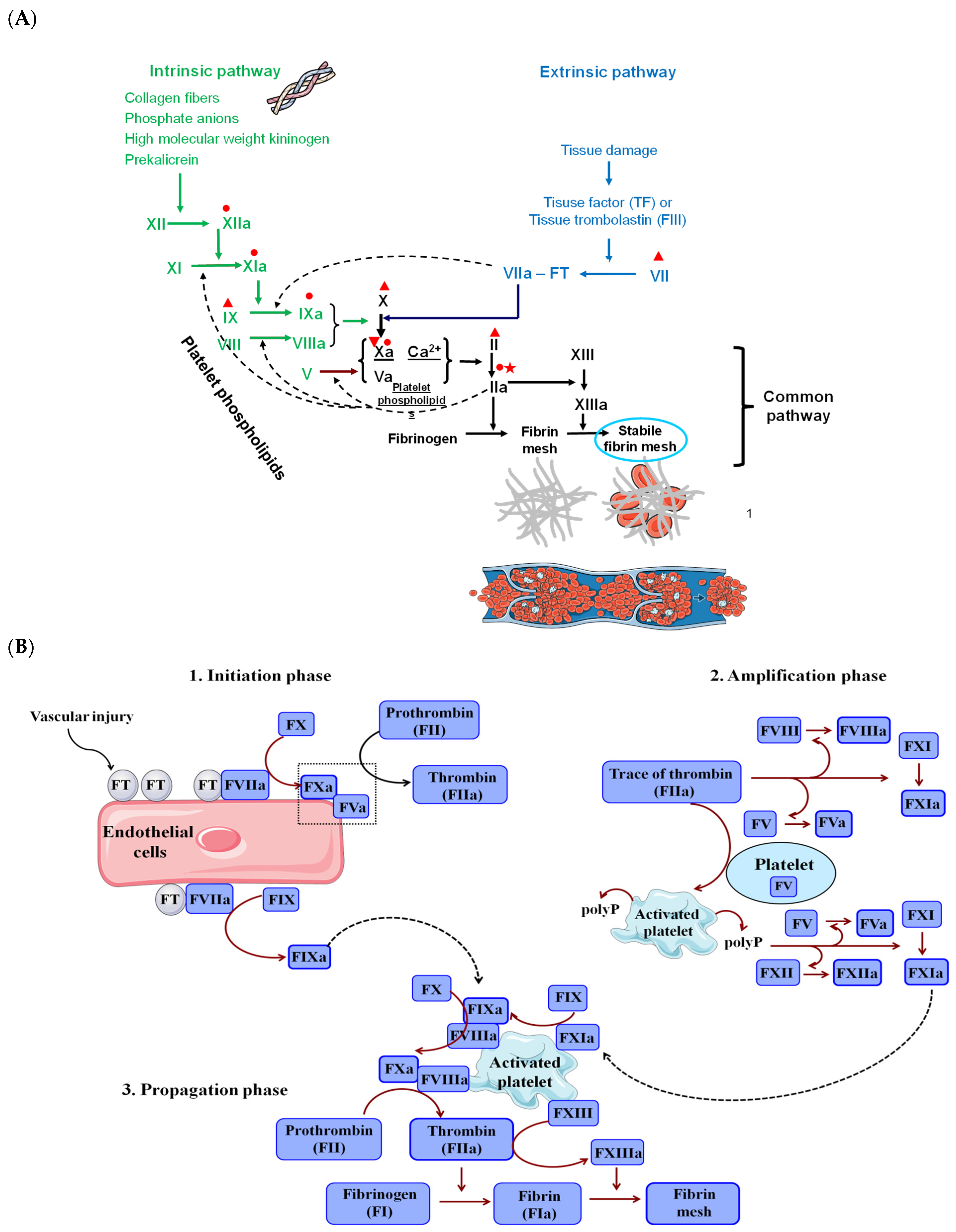 —LMWHs, ULMWHs, DOACs, hirudin, parenteral direct inhibitors of clotting factor IIa (ar-gatroban, desirudin, lepirudin, bivalirudin), heparinoids (danaparoid); (B) the three phases of the coagulation process [26,27,28,29,30].