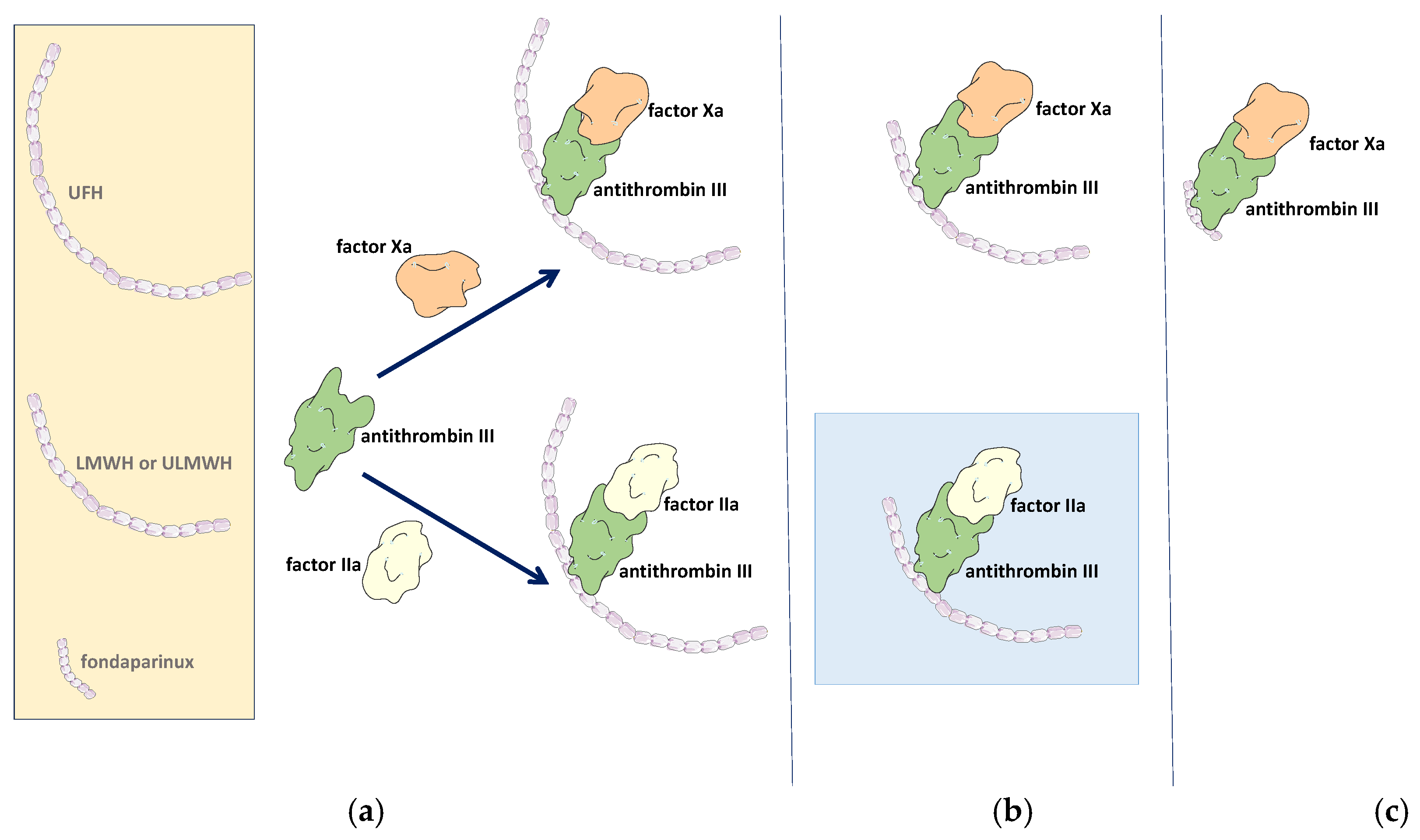 | Unfractioned heparin (UFH) | indirect inhibition of the clotting factor IIa (thrombin) and Xa, by interaction with ATIII (enhances the affinity of ATIII for both clotting factors Xa and IIa) | Heparin | Mean MW: 15,000 kDa (range, 3000–30,000) |