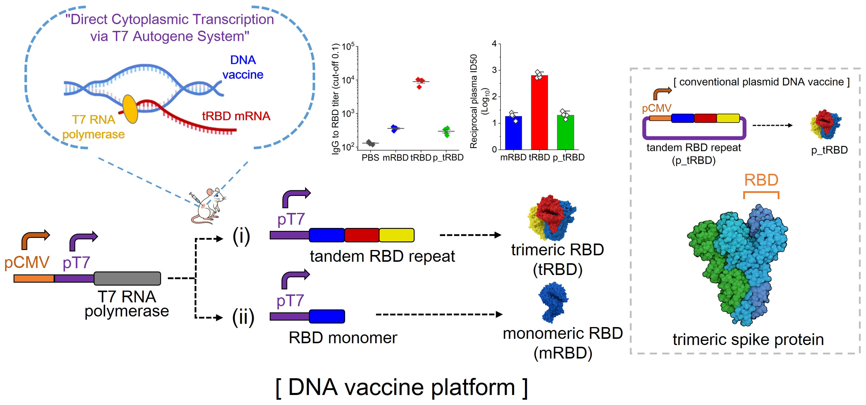 In this study, we investigated the immunogenic properties of a DNA vaccine encoding a trimeric receptor-binding domain (tRBD) of SARS-CoV-2, delivered via a cytoplasmically active T7 autogene-based transcription platform. Previous studies have shown that trimeric or heterotrimeric RBD constructs used in protein subunit vaccine systems more closely resemble the native spike trimer, thereby improving antigen stability and promoting effective B cell receptor cross-linking [