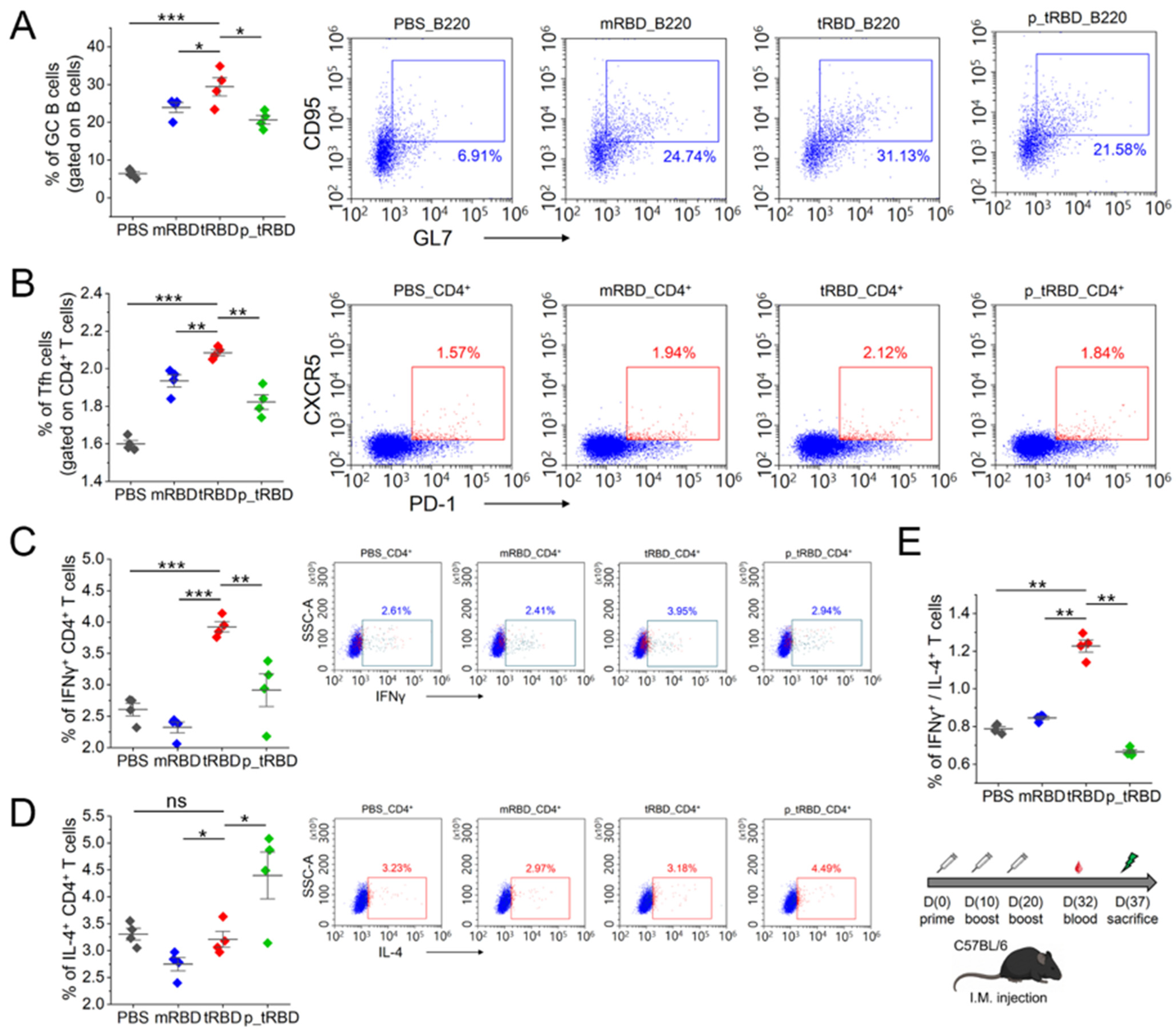 Figure 4 demonstrates that this cellular activation occurred within a regulated Th1-biased environment, as reflected by elevated IFNγ/IL-4 ratios while preserving measurable Th2-associated responses that support B cell function. Within this immunological context established through booster immunizations, a modest increase in T follicular helper (Tfh) cell frequencies was observed. Given the established role of Tfh cells in supporting germinal center reactions and B cell affinity maturation [