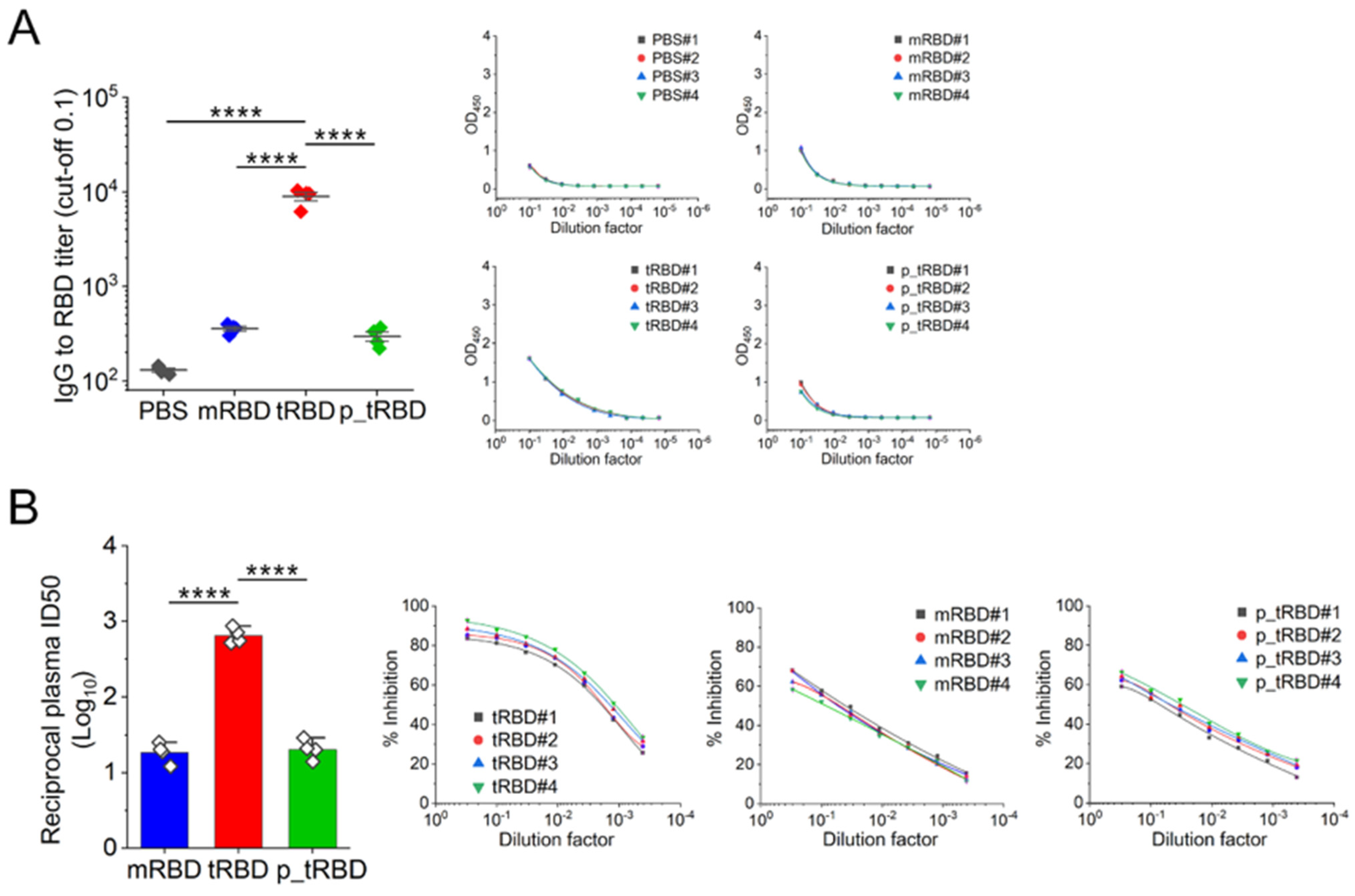 27]. This immunization procedure followed a three-dose regimen, with each dose given at two-week intervals. Control groups were included for comparison, receiving either PBS (100 µL), Rpol/mRBD/LNP (14.0 µg/100 µL), or p_tRBD/LNP (18.4 µg/100 µL). The reported vaccine dose indicates the total mass of the LNP formulation (DNA + lipid components). Specifically, the Rpol/tRBD/LNP formulation (18.4 µg per dose) contained 1.04 µg of Rpol/tRBD DNA and 17.36 µg of lipids; the Rpol/mRBD/LNP formulation (14.0 µg per dose) contained 0.79 µg of Rpol/mRBD DNA and 13.21 µg of lipids; and the p_tRBD/LNP formulation (18.4 µg per dose) contained 1.52 µg of p_tRBD plasmid DNA and 16.88 µg of lipids. The DNA inputs were normalized to an equimolar basis (Rpol/tRBD:Rpol/mRBD:p_tRBD = 1:1:1). Blood was drawn from the submandibular vein and promptly mixed with a 4% citrate solution (at 10% of the total blood volume) to inhibit clot formation. Plasma was subsequently isolated by centrifugation at 2000×