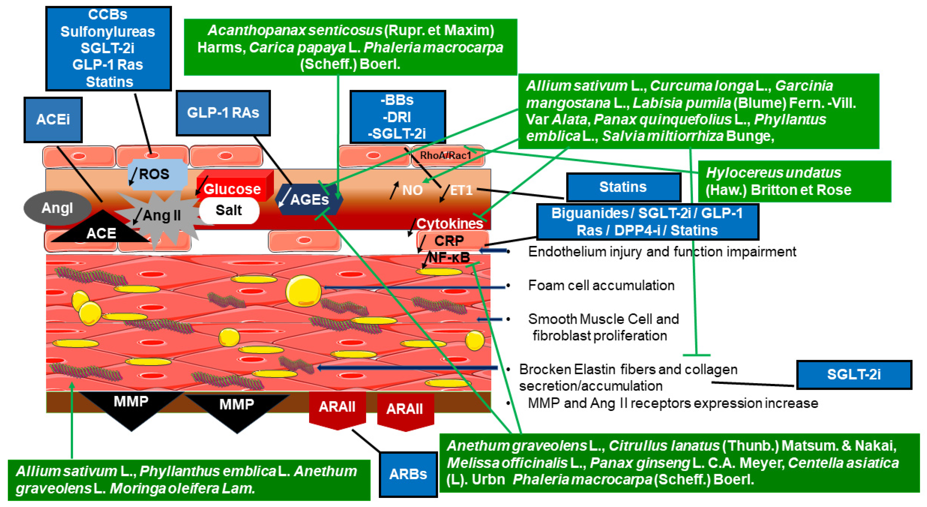 | Clusiaceae | ![]() | Garcinia mangostana L. | Reduced AS, AVI, and API; amplified aortic vasodilation; inhibition of vascular AGE formation; reduced Hb1Ac, total cholesterol, and LDL-C; reduced VCAM-1 expression; antioxidant and anti-inflammatory properties; inhibition of the ACE enzyme, RAAS, and SGLT-2. |