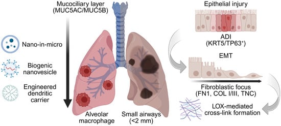 Barrier-aware design context for inhaled nanomedicine in the diseased lower airways. Representative inhalable nanocarrier classes considered in this review (nano-in micro, biogenic nanovesicles/exosomes, and dendritic nanocarriers). In the diseased lung, alveolar loss and microenvironmental changes including epithelial–mesenchymal transition (EMT) repopulate the airway with alveolar differentiation intermediates (ADI, KRT5/TP63+), accompanied by basal lamina and interstitial remodeling characterized by fibronectin 1 (FN1) scaffolding, type I/III collagen deposition, and lysyl oxidase (LOX)-mediated cross-linking. These features define airway-specific barriers (mucus, macrophage clearance, remodeled ECM) and motivate the development of barrier-aware surface chemistries. nano-in-micro aerodynamic packaging, and imaging-guided readouts developed in subsequent sections. The vertical arrow denotes the proximal-to-distal airway axis, highlighting the shift from mucociliary clearance in the conducting airways to macrophage-dominated clearance in the distal lung. Created in BioRender. Lee, J. (2026) https://BioRender.com/0lxxd1i (accessed on 22 January 2026).