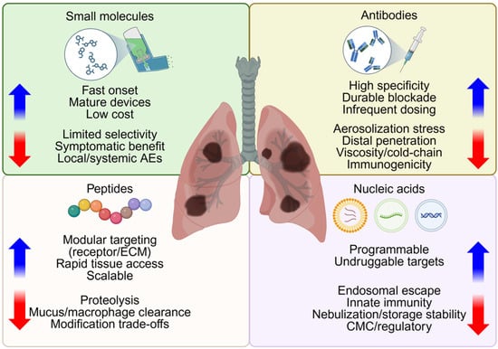 Considerations in selection of therapeutic modalities for inhalation therapy. Small molecules, antibodies, peptides, and nucleic acids are potential therapeutic modalities for nanoparticle delivery. This quadrant diagram highlights class-specific advantages (blue arrows) and potential limitations (red arrows) relevant to aerosolization, epithelial access, retention and clinical application of therapies for diseased lower airways. Created in BioRender. Lee, J. (2026) https://BioRender.com/t6efy0g (accessed on 22 January 2026).