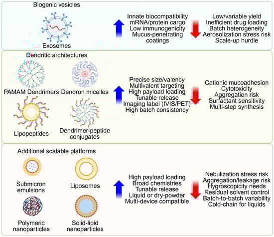 Platform benchmarking for inhaled nanomedicine. Biogenic vesicles, engineered dendritic architectures, and additional scalable platforms are organized under a common barrier-aware framework. For each family, key design parameters, biocompatibility, architectural precision, and manufacturing feasibility are compared. Created in BioRender. Lee, J. (2026) https://BioRender.com/smxxd73 (accessed on 22 January 2026).