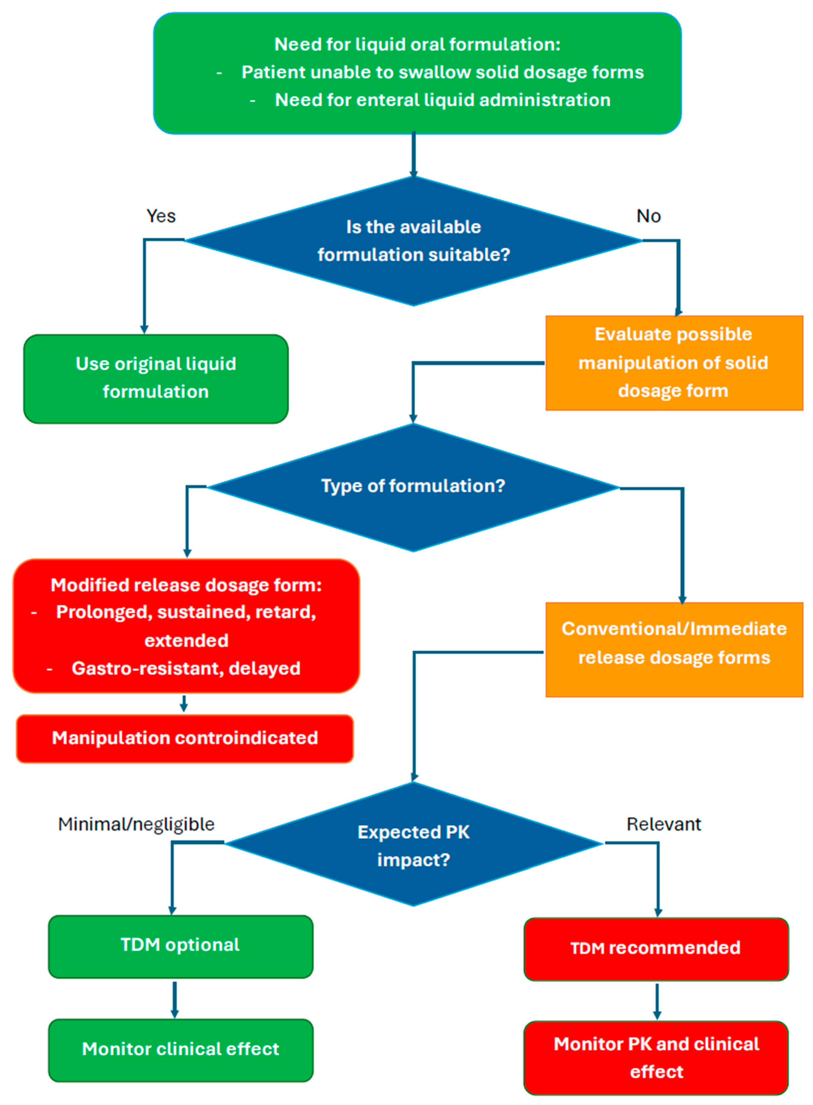 | Drug (Product) | Dosage Form and Release Characteristics | Type of Manipulation | Key Pharmacokinetic Findings | Clinical Implications | Role of TDM |