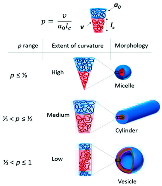 Amphiphilic block copolymers, including diblock copolymers (AB type), triblock copolymers (ABA or ABC type), and multiblock copolymers, as well as double-hydrophilic copolymers, can self-assemble in an aqueous environment. This self-assembly leads to the formation of various nanostructures, such as spherical, “flower-like,” “worm-like,” and vesicular shapes. Several factors influence the self-assembling behavior of these polymers, including temperature, pH, salt concentration, polymer concentration, the type of solvent used, and the structure and length of the polymer blocks [31]. The formation of polymer micelles with different morphologies can be predicted based on the so-called packing parameter p = ν/(a0.lc). This parameter is a key characteristic of amphiphilic polymers and is determined by their composition, where v is the volume of the hydrophobic chain, a0 is the optimal area of the head group, and lc is the length of the hydrophobic tail (Figure 2). As a rule, spherical micelles are favored when p ≤ 1/3, cylindrical micelles are favored when 1/3 ≤ p ≤ 1/2, and enclosed membrane structures (vesicles, also known as polymersomes) are favored when 1/2 ≤ p ≤ 1 [36].
