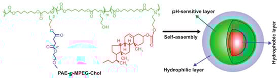 Poly(β-amino ester) (PAE) is another pH-responsive polycationic polymer used, which contains tertiary amine groups and has a pKb value around 6.5. When the pH is higher than the pKb, the PAE is deprotonated and insoluble in water, and when the pH is lower than the pKb, the PAE is able to be protonated sequentially and becomes soluble because of the ionization of the amine residues. This physicochemical property of PAE provides a significant potential in pH-triggered controlled drug release [165]. For example, amphiphilic methyl ether poly(ethylene glycol) (MPEG) and pH-responsive biodegradable poly(β-amino ester) (PAE) copolymer were used to prepare nanosized polymeric micelles, which exhibit a pH-dependent micellization/demicellization transition at tumor acidic pH 6.4, owing to the tertiary amine (pKb 6.5) in PAE. The micelles were prepared by the solvent evaporation method, and the core of the micelles was efficiently loaded (74.5%) with doxorubicin (DOX). The in vitro drug release study showed noticeable pH-dependent micellization–demicellization behavior, with rapid release of DOX from the micelles in weakly acidic environments (pH 6.4) but very slow release under physiological conditions (pH 7.4). Moreover, due to demicellization, the tumor cell uptake of DOX released from polymeric micelles was much higher at pH 6.4 than at pH 7.4. When the in vivo antitumor activity of pH-responsive polymeric micelles was evaluated by injecting the DOX-loaded polymeric micelles into B16F10 tumor-bearing mice, these micelles notably suppressed tumor growth and also prolonged the survival of the tumor-bearing mice, compared with mice treated with free DOX [166]. Similarly, camptothecin-loaded MPEG-PAE pH-responsive micelles were prepared by a solvent-casting method, and antitumor efficacy in MDA-MB-231 tumor-bearing mice was studied. The fluorescent dye tetramethylrhodamine isothiocyanate (TRITC) and the anticancer drug camptothecin (CPT) were efficiently encapsulated in the MPEG-PAE micelles, achieving a drug-loading efficiency of about 80%. The tumor-specific pH responsiveness of the MPEG-PAE micelles in MDA-MB231 human breast tumor-bearing mice was monitored via non-invasive fluorescence imaging. The encapsulated CPT exhibited effective pH-responsive release, while TRITC showed enhanced targeting to tumor tissue, being 11 times more effective than non-responsive MPEG-PLLA micelles used for comparison. Thus, prepared CPT-loaded micelles exhibited significantly increased therapeutic efficacy in breast tumor-bearing mice with minimum side effects in other tissues, compared to free CPT and CPT-encapsulated PEG-PLLA micelles [167]. Furthermore, a novel amphiphilic copolymer, poly(ethylene glycol)-b-(poly(lactic acid-co-poly(β-amino ester) (MPEG-b-(PLA-co-PAE), was synthesized, in which hydrophobic PLA and pH-sensitive PAE segments were randomly distributed within the core-forming block. Doxorubicin (DOX) was used as a model anticancer drug to prepare drug-loaded micelles. This random copolymer design was intended to uniformly distribute pH-responsive domains throughout the micellar core, thereby reducing burst drug release and enhancing drug-loading capacity. Thus, by adjusting the PAE content or environmental pH, drug release behavior can be precisely modulated. The cytotoxicity test demonstrated that the DOX-loaded micelles retained high cytotoxicity against HepG2 cells [168]. Next, an amphiphilic pH-sensitive triblock copolymer, poly(β-amino ester)-g-poly(ethylene glycol) methyl ether-cholesterol (PAE-g-MPEG-Chol), was developed to achieve controlled drug release under acidic conditions (Figure 6).