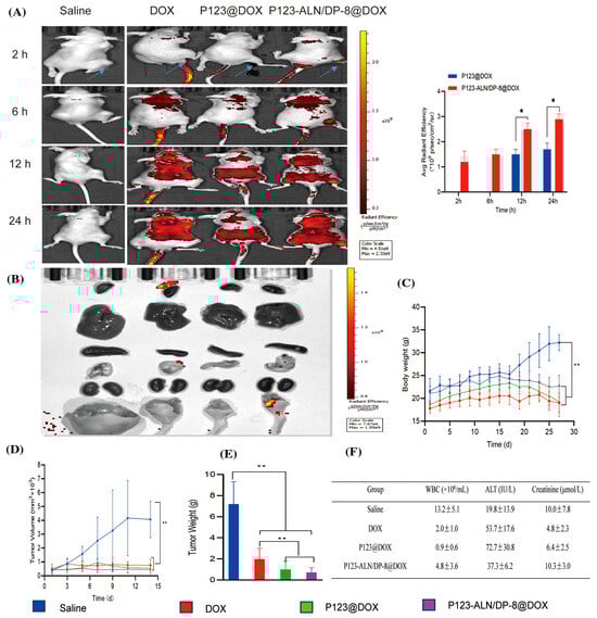 In vivo biodistribution and therapeutic efficacy in a murine breast cancer bone metastasis model. Saline (control), free DOX, P123@DOX micelles, and P123-ALN/DP-8@DOX micelles were intravenously administered on days 14 and 21 (DOX dosage of 5 mg/kg). (A) Representative whole-body fluorescence images of tumor-bearing mice 2, 6, 12, and 24 h after intravenous injection of treatments. (B) Representative fluorescence images of the organs at the end of the experiment. (C) Body weight of mice as a function of time after intratibial MDA-MB-231 cell inoculation and therapy. (D) Tumor volume. (E) Tumor weight at the end of the experiment. (F) Blood chemistry at the end of the experiment. Data are expressed as the mean ± SD (n = 6). * p < 0.05, and ** p < 0.01 [216] (this work is licensed under a Creative Commons Attribution 4.0 International License).