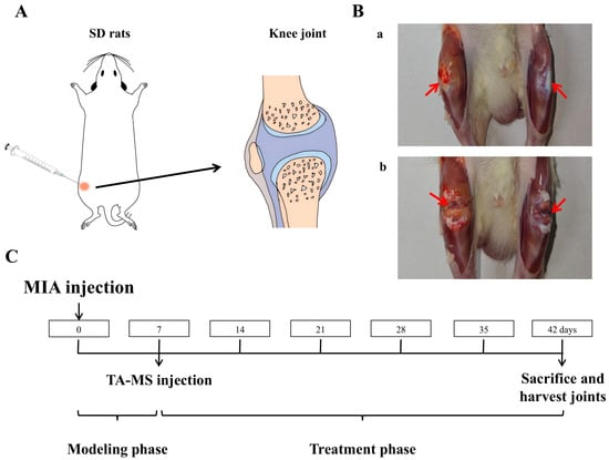 TA microspheres for the study of knee arthritis in rats: (A) is a schematic diagram of the injection into the rat knee joint, (B) is an effect diagram of the modeling of knee arthritis (a: Knee joint after skin incision, b: Joint cavity after incision, comparison between the right knee with arthritis and the healthy left knee), and (C) is the timeline of animal research.