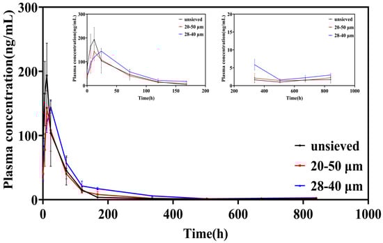 Area Under the Curve (AUC): The AUC values in the 28–40 μm group exhibited an increasing trend. Although these values were not always statistically significantly different from those in the 20–50 μm group, this trend indicated that the microspheres in this group had a more uniform particle size, thus resulting in more complete drug release. A uniform particle size may enhance the bioavailability of the drug at the injection site.