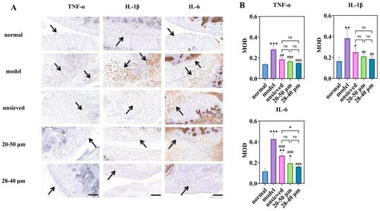 Immunohistochemical study of microspheres with different polydispersity: (A) is the immunohistochemical staining for inflammatory factors (magnification 40×, scale bar 200 μm), (B) is a semi-quantitative analysis of optical density values (MOD) for IHC sections (n = 3). * Indicates the comparison between each group and the normal group, *: p < 0.05, **: p < 0.01, ***: p < 0.001, # Indicates the comparison between each group and the model group, #: p < 0.05, ##: p < 0.01, ###: p < 0.001. (ns: p > 0.05, Arrows point to the prominent positive staining in the sections).