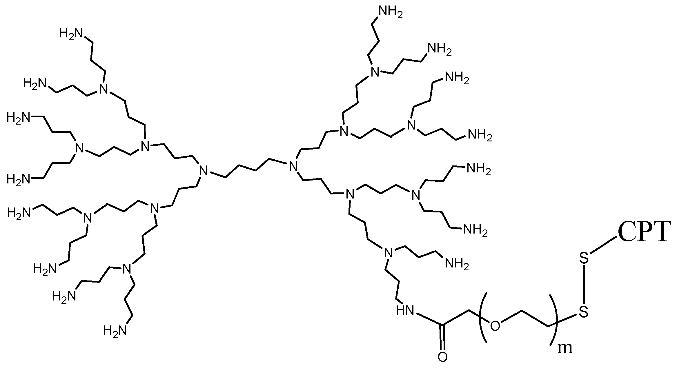 Generation 3-diaminobutyric poly(propylenimine) dendrimer (DAB) (1 equivalent, 60 mg) was dissolved in 1.5 mL of dimethyl sulfoxide (DMSO) and stirred at 25 °C for 10 min. In parallel, OPSS-PEG-SCM (1 equivalent, 81.59 mg) was dissolved in 1.5 mL of DMSO, and then added dropwise to the DAB solution. The reaction mixture was protected from light and stirred for 6 h at 37 °C. After 6 h, a freshly prepared solution of thiolated camptothecin (2 equivalents; 31.03 mg in 1.5 mL DMSO) was added to the PEGylated-DAB and the mixture was stirred for 16 h at 37 °C in the dark.
