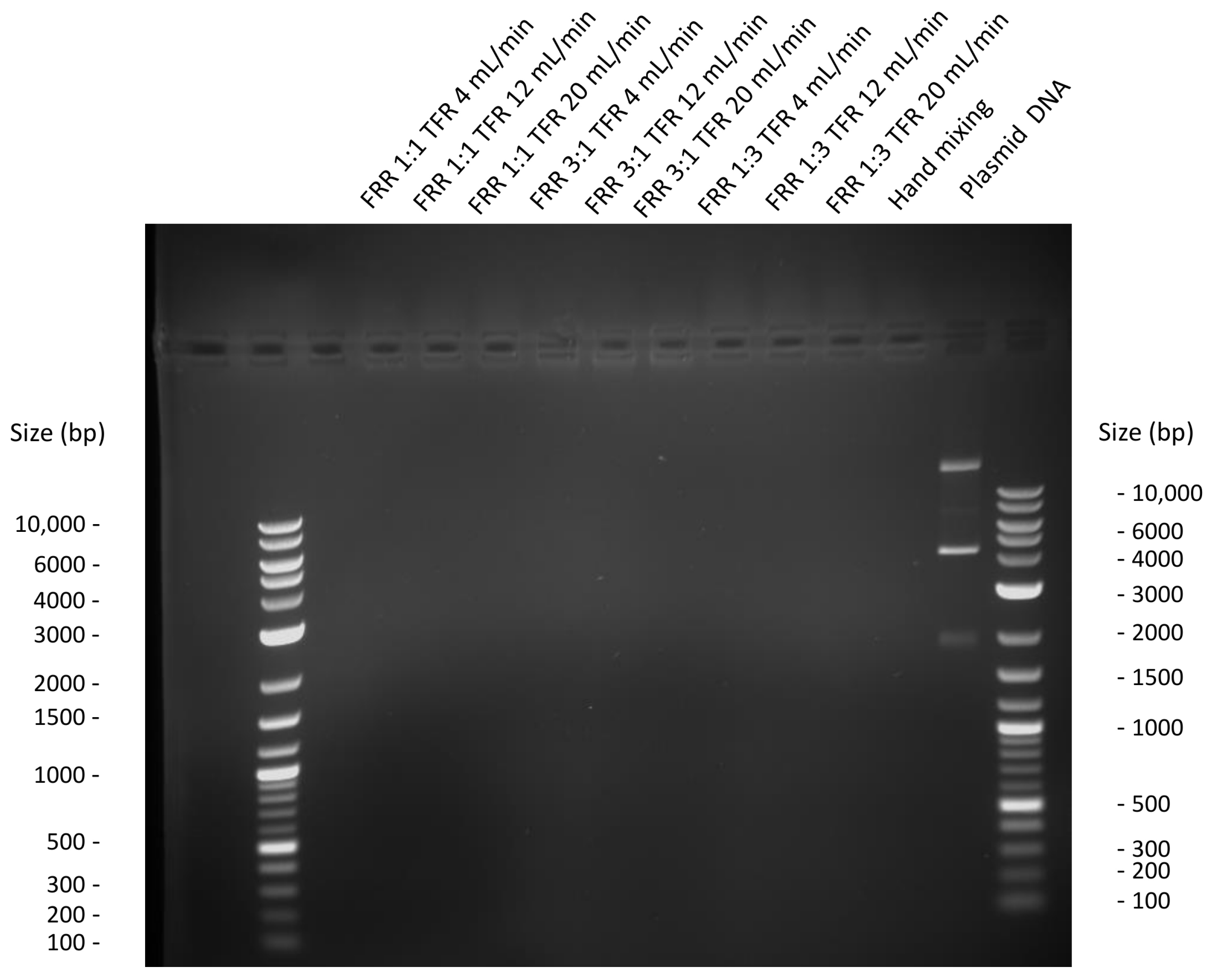 Dendriplexes prepared by microfluidics or by hand mixing were assessed for DNA complexation using agarose gel electrophoresis. Complexes were formulated at a dendrimer: DNA weight ratio of 20:1 in 5% (w/v) glucose solution, with a fixed final DNA concentration of 10 µg/mL. Aliquots were loaded on a 0.7% (w/v) agarose gel prepared in 1X Tris-acetate-EDTA (TAE) buffer containing ethidium bromide (0.4 μg/mL). The running buffer was also 1x TAE containing ethidium bromide (0.4 μg/mL). 1 kb Plus DNA ladder (New England Biolabs, Hitchin, UK) was used as a DNA size marker. Electrophoresis was carried out at 50 V for 1 h and gels were subsequently visualized under UV illumination to assess DNA migration.