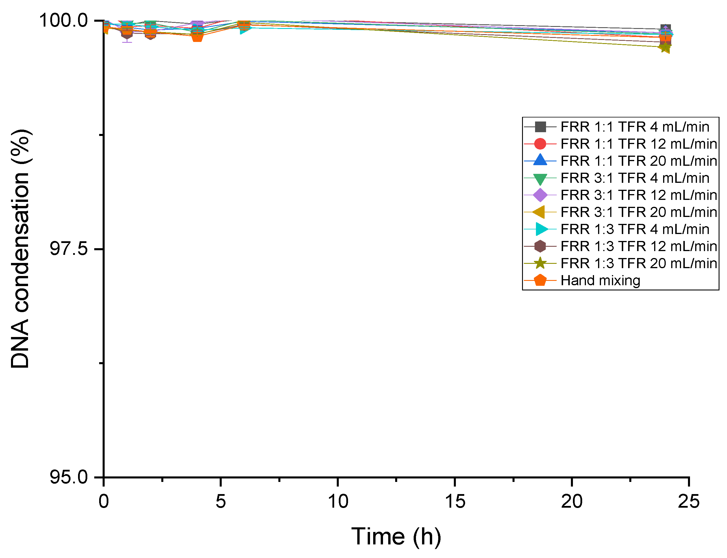 The gel retardation and PicoGreen® assays confirmed that DAB-CPT dendrimers efficiently condensed plasmid DNA under all microfluidic conditions tested (TFR 4–20 mL/min; FRR 1:1, 3:1, 1:3), with more than 99% condensation maintained for at least 24 h, comparable to hand-mixed complexes. Efficient condensation is essential to protect DNA against nuclease degradation and to promote cellular uptake, but overly strong binding can hinder intracellular DNA release and limit gene expression. The sustained high level of condensation observed here suggests that microfluidic processing does not compromise DNA complexation, and that any differences in transfection between formulations are more likely related to size, morphology and intracellular trafficking than to initial DNA binding.