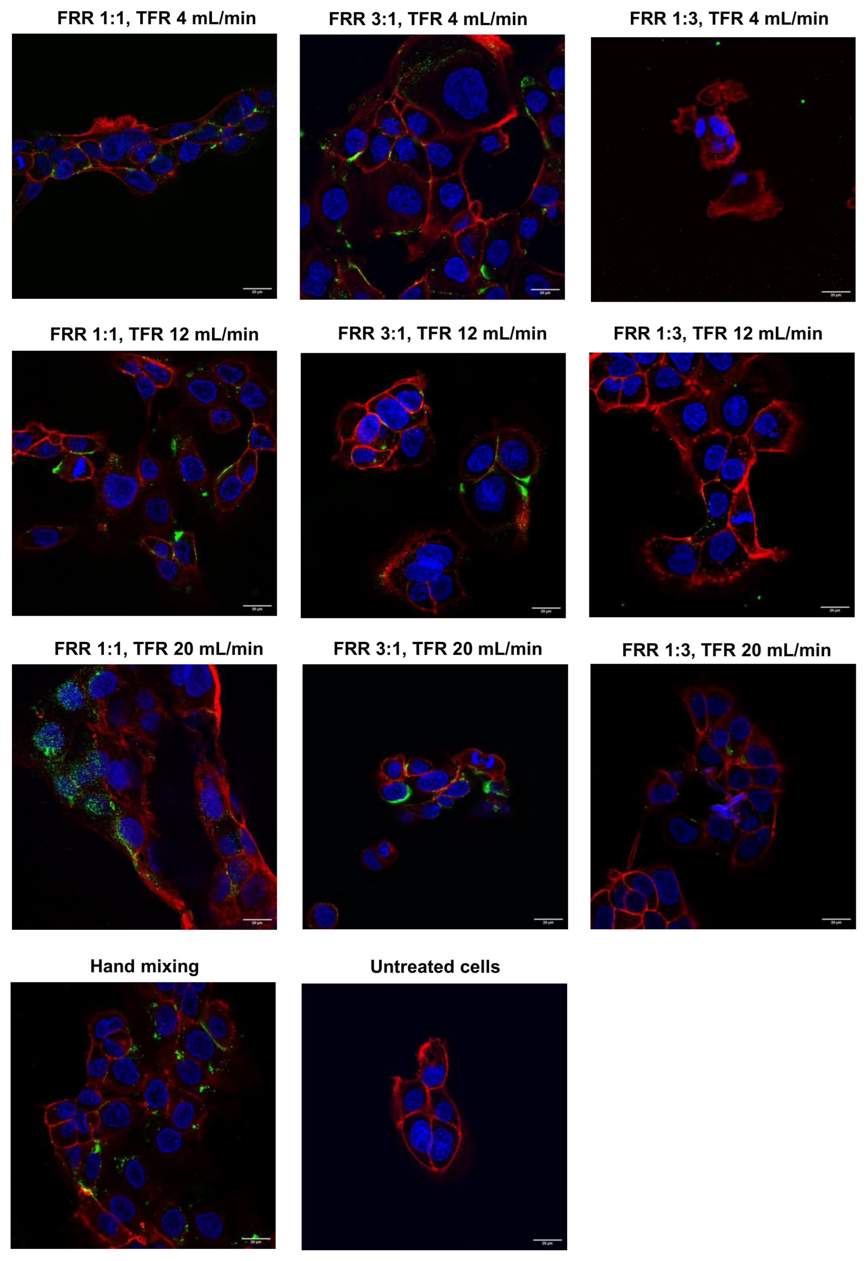 40]. By contrast, FRR 1:3 produced larger complexes and lower uptake, which may reflect less favorable assembly kinetics and a higher propensity for aggregation [
