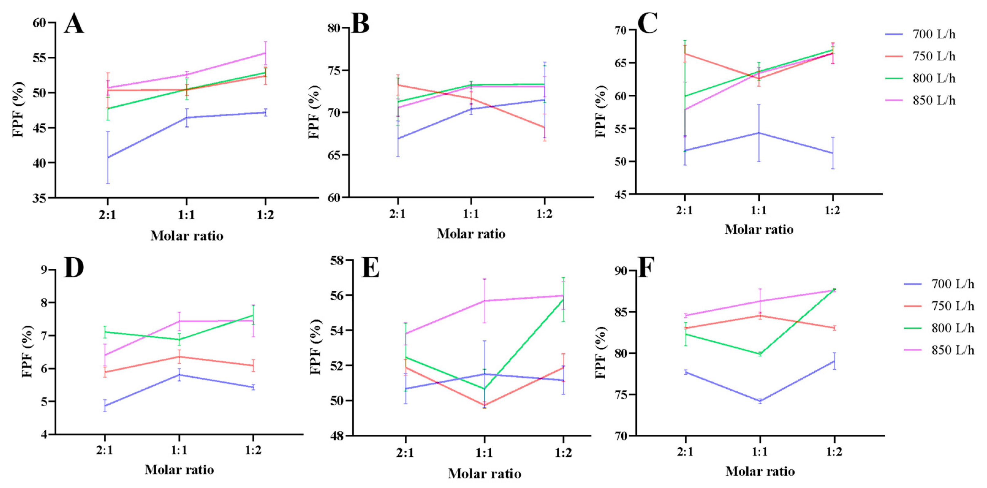 | Conditions | Molar ratio, Atomization Gas Flow Rate (L/min) |