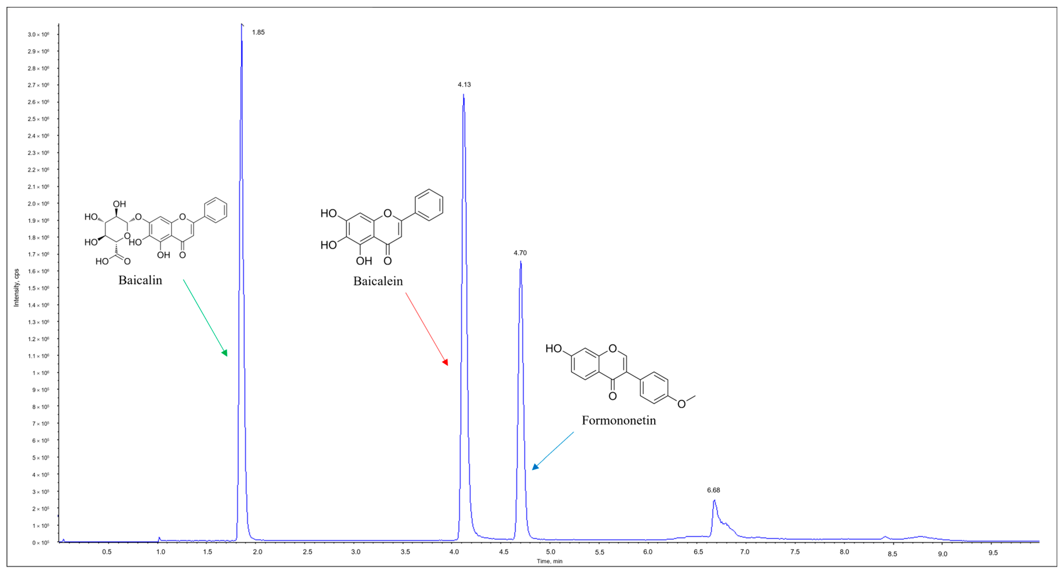 - Wang, H.; Sun, Y.; Guo, W.; Wang, J.; Gao, J.; Peng, W.; Gu, J. Identification and high-throughput quantification of baicalein and its metabolites in plasma and urine. J. Ethnopharmacol. 2023, 301, 115853. [Google Scholar] [CrossRef] [PubMed]