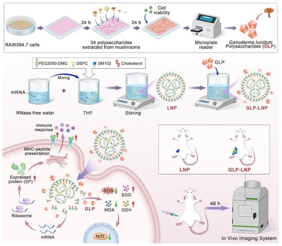 We first screened 34 natural polysaccharides for bioactive properties in macrophages, identifying candidates with proliferative effects. This systematic evaluation identified Ganoderma lucidum polysaccharide (GLP) as a prime candidate, aligning with its millennia-long recognition in Asian pharmacopeia as ‘the mushroom of immortality’ [16]. Modern studies substantiate GLP’s multifunctional capacities, including potent antioxidant, immunomodulatory, and antitumor activities [17,18,19,20,21,22], establishing it as a premier biological response modifier (BRM) with significant adjuvant potential [23]. Subsequent phases characterized the GLP’s physicochemical profile and assessed its capacity to enhance mRNA transfection efficiency in vitro while modulating oxidative responses. Parallel investigations compared formulation-driven variations in cellular stress markers and quantified in vivo protein expression dynamics. Our work transcends current adjuvants’ constraints by demonstrating natural GLPs’ capacity as a dual-action adjuvant that simultaneously mitigates toxicity and enhancing efficacy, thus establishing a nature-derived adjuvant for next-generation mRNA vaccines (Figure 1).