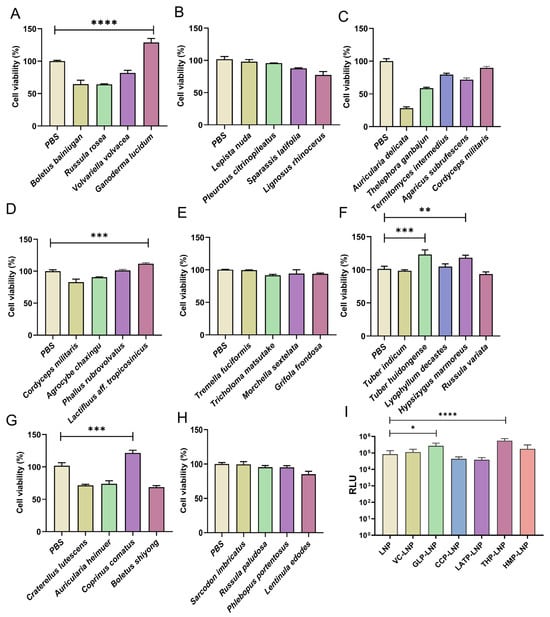 (A–H) Proliferation effect of 34 natural polysaccharides on RAW264.7 cells, (n = 3). (I) In vitro transfection efficiency of various polysaccharide-modified LNPs, (n = 5). * p < 0.05, ** p < 0.01, *** p < 0.001, **** p < 0.0001.