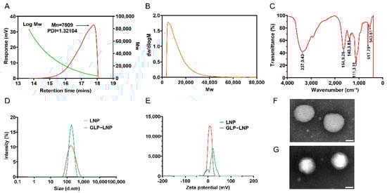 (A) Retention time and (B) molecular weight distribution of GLP determined by GPC. (C) FTIR spectrum of GLP. (D,E) Size distribution and zeta potentials of LNP and GLP-LNP formulations. TEM images of (F) LNP and (G) GLP-LNP. Bar = 50 nm.